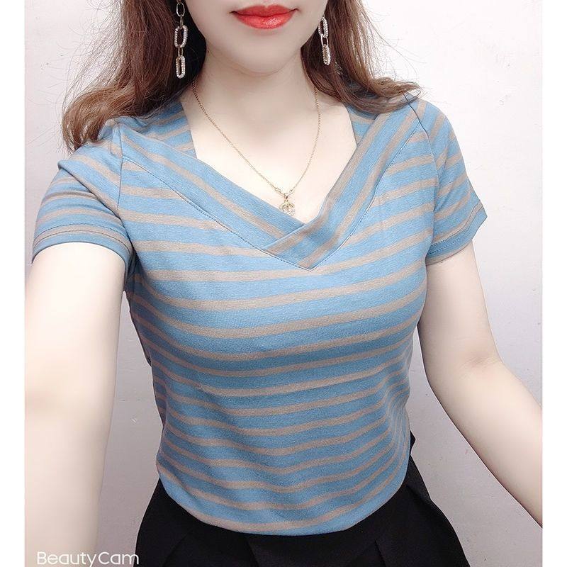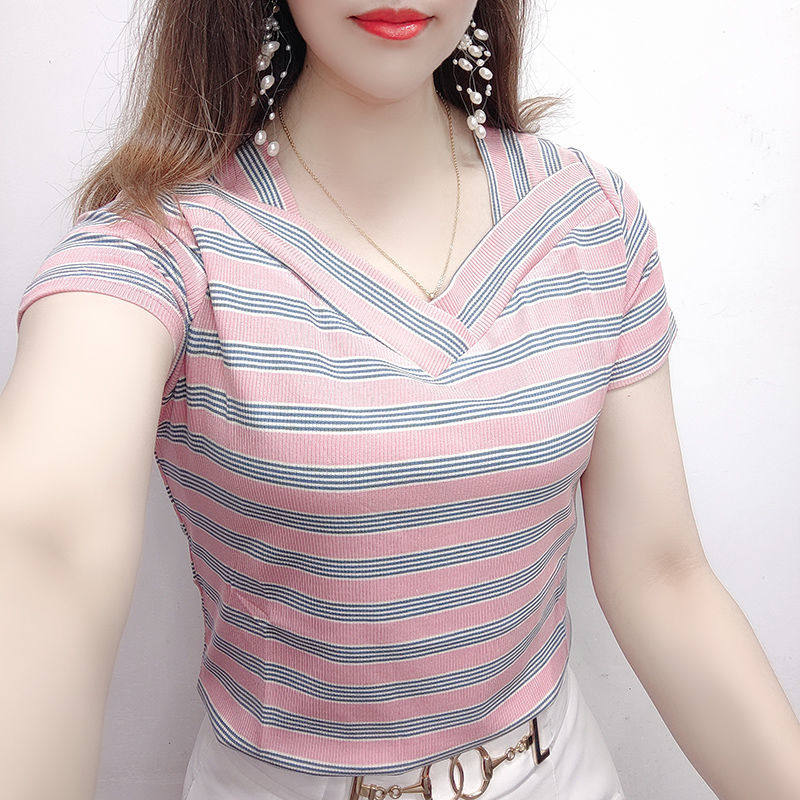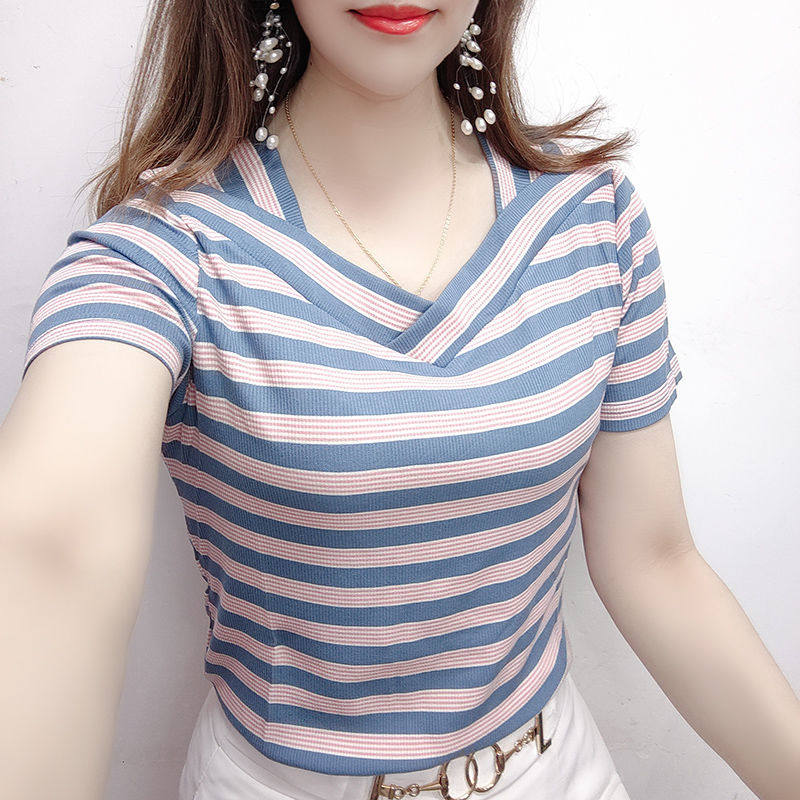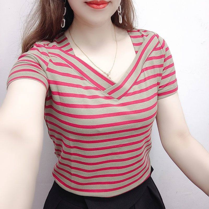 一字肩纯棉女士短袖t恤夏季休闲百搭宽松显瘦小众短款条纹v领上衣