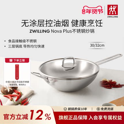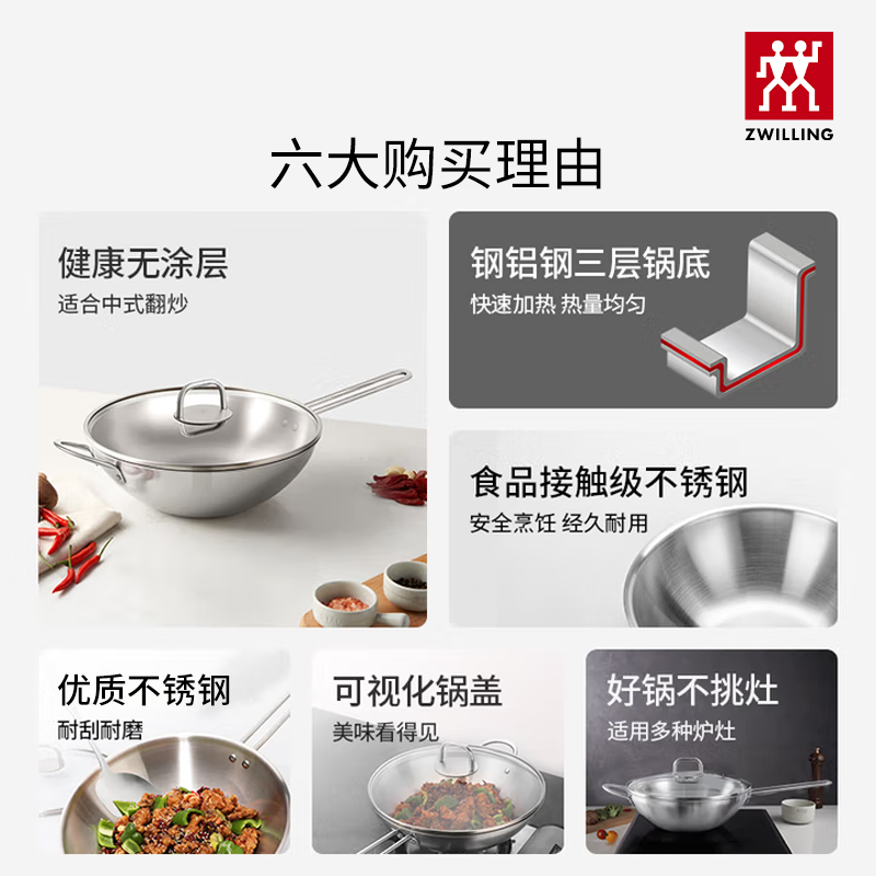 德国双立人不锈钢炒锅中式大容量炒锅无涂层家用锅具炒菜锅厨房