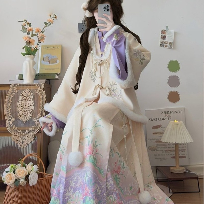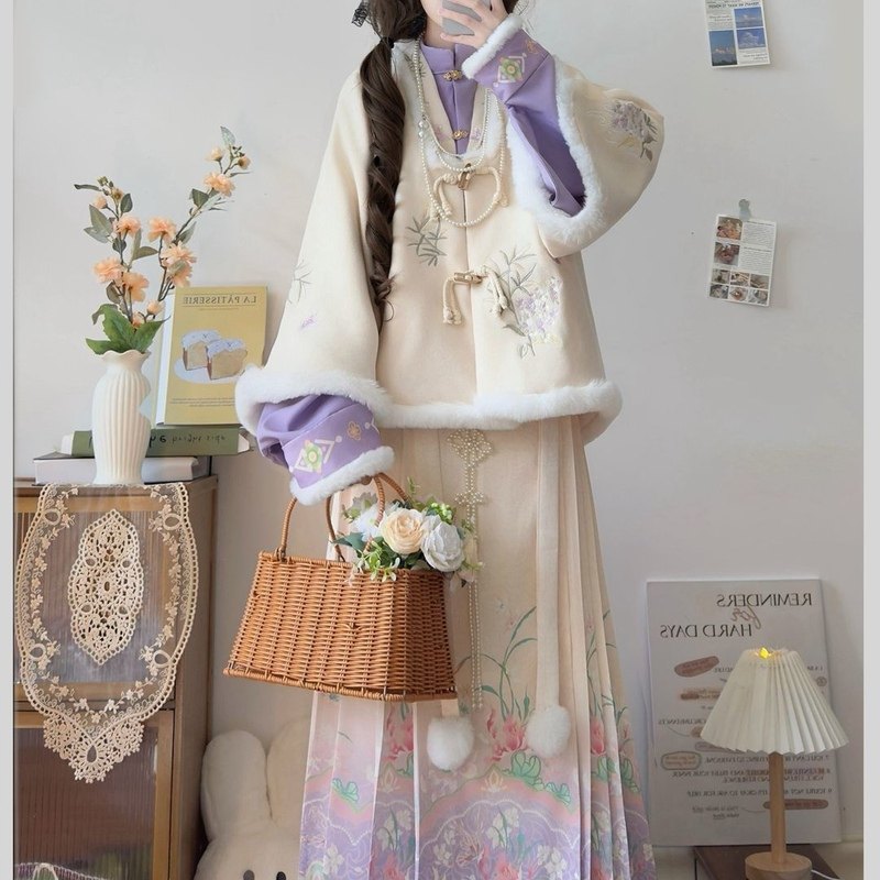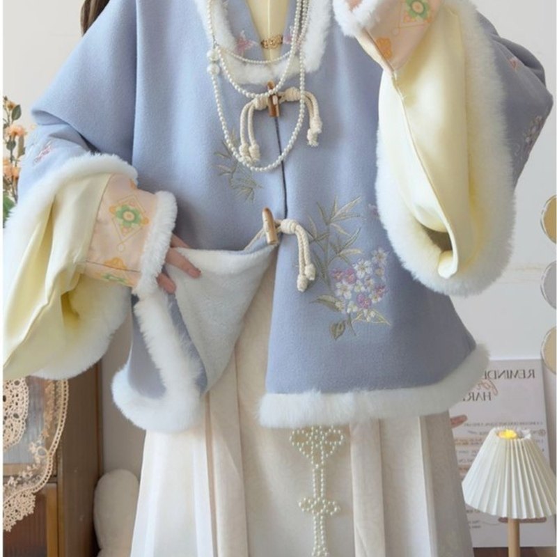 明制汉服女【冬日信笺】刺绣加绒披袄立领琵琶袖马面裙新年战袍冬