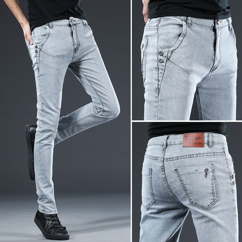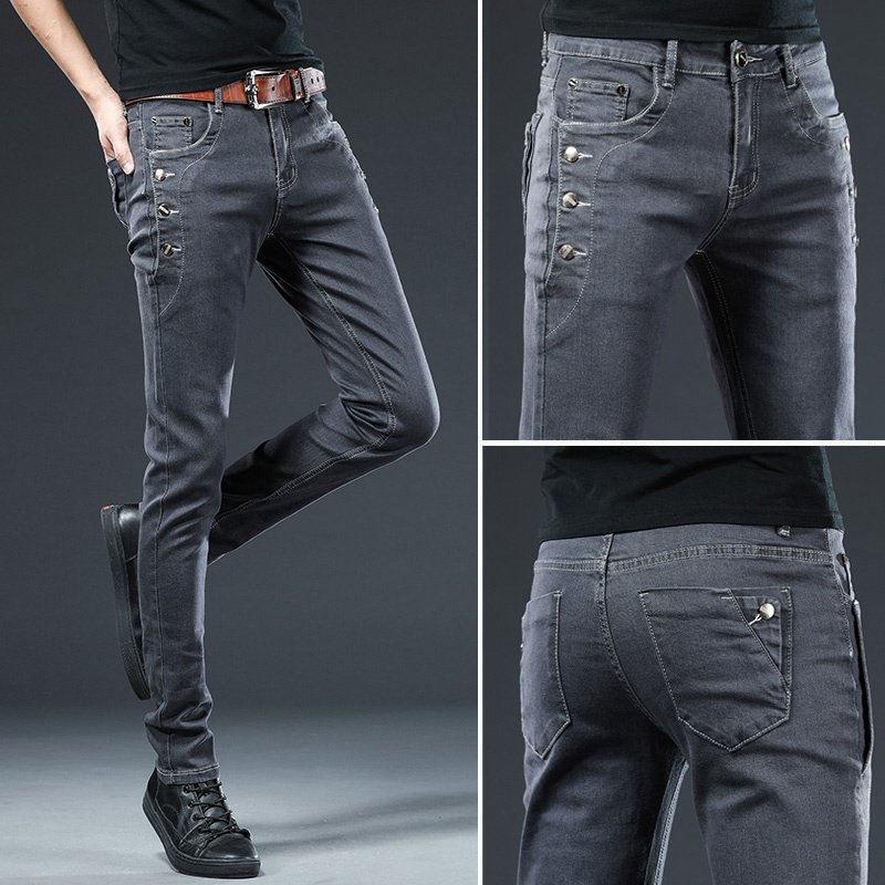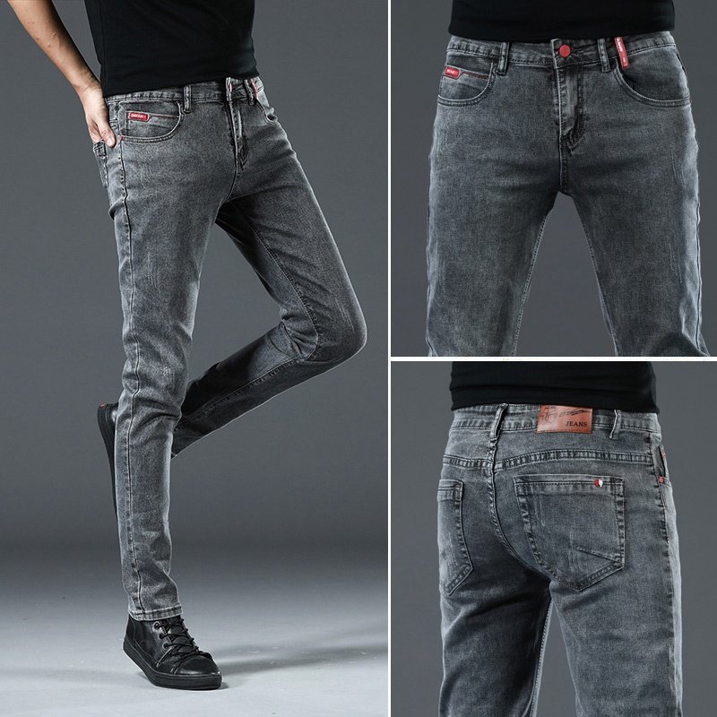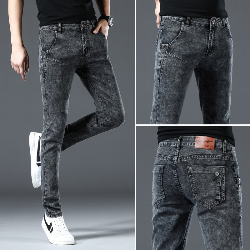 男裤子冬季休闲烟灰色复古雪花弹力牛仔裤男修身小脚裤潮流长裤子