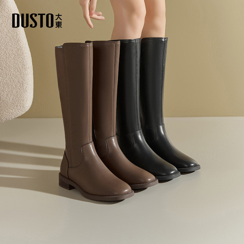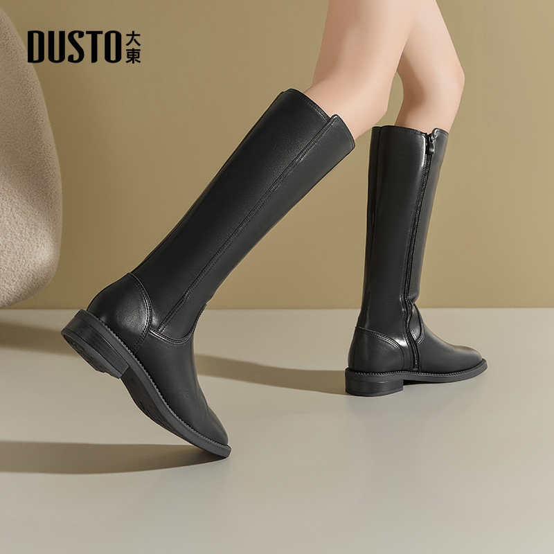 大东骑士靴女鞋2025冬季新款休闲方跟低跟侧拉链方头长筒靴0167