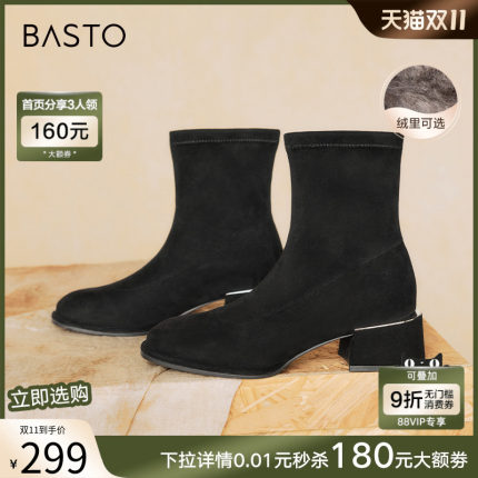 百思图冬商场法式绒面弹力瘦瘦靴加绒粗跟女短靴E0283DD4Z