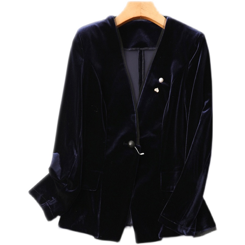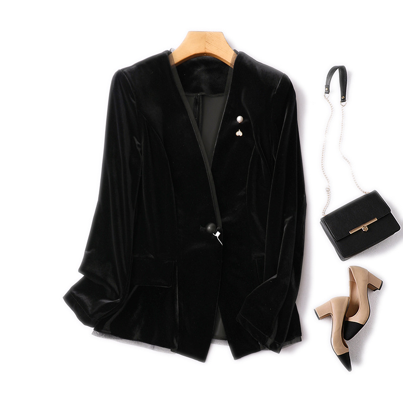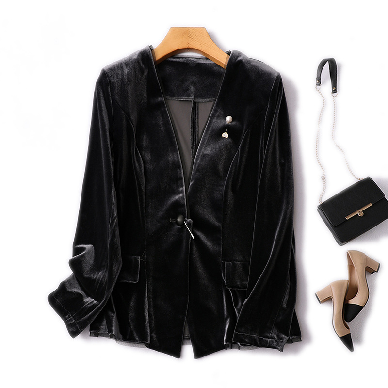 轻奢尾货原单折扣女装春季新款高档气质V领金丝绒大码小西装外套