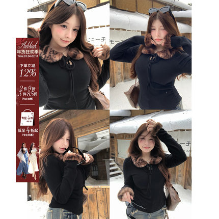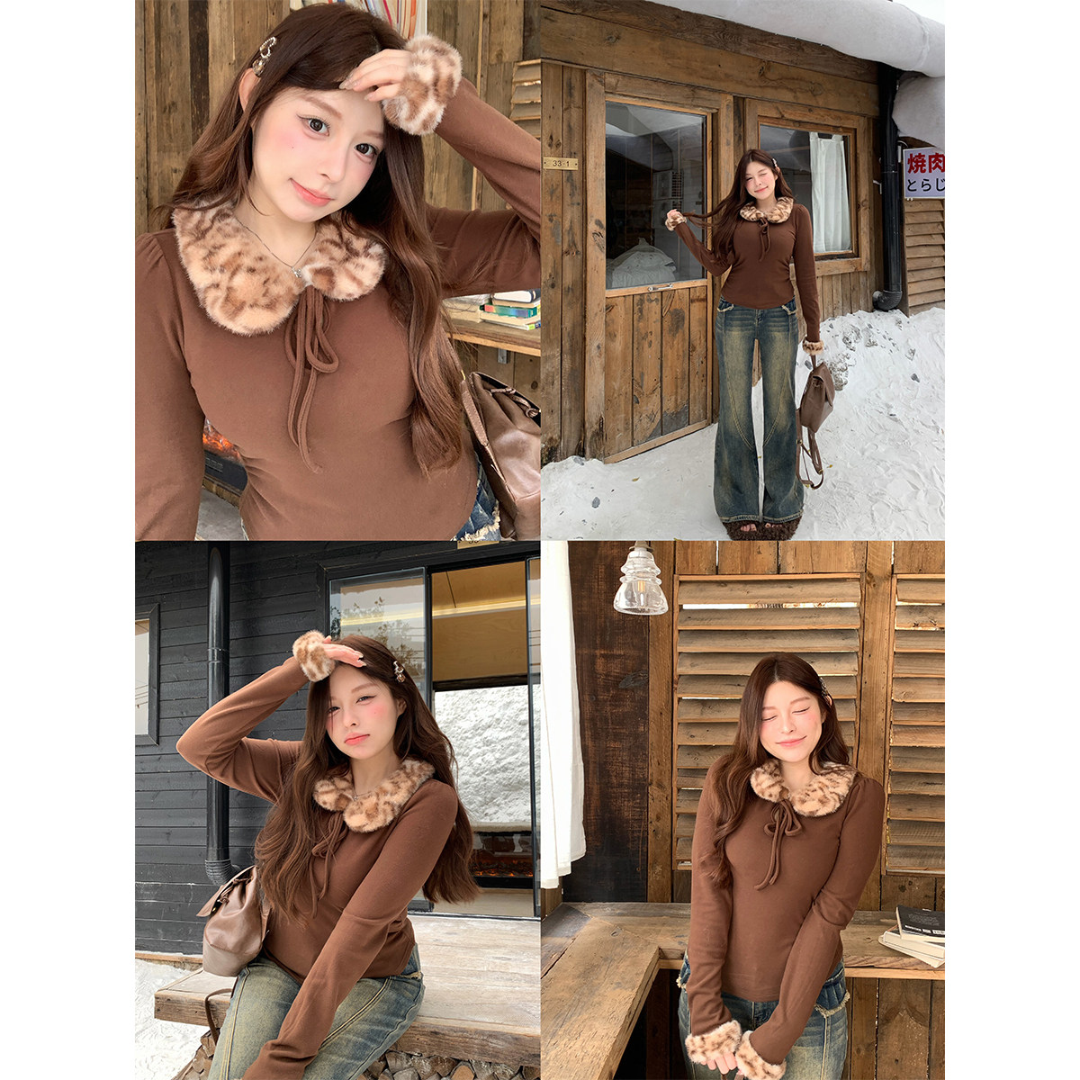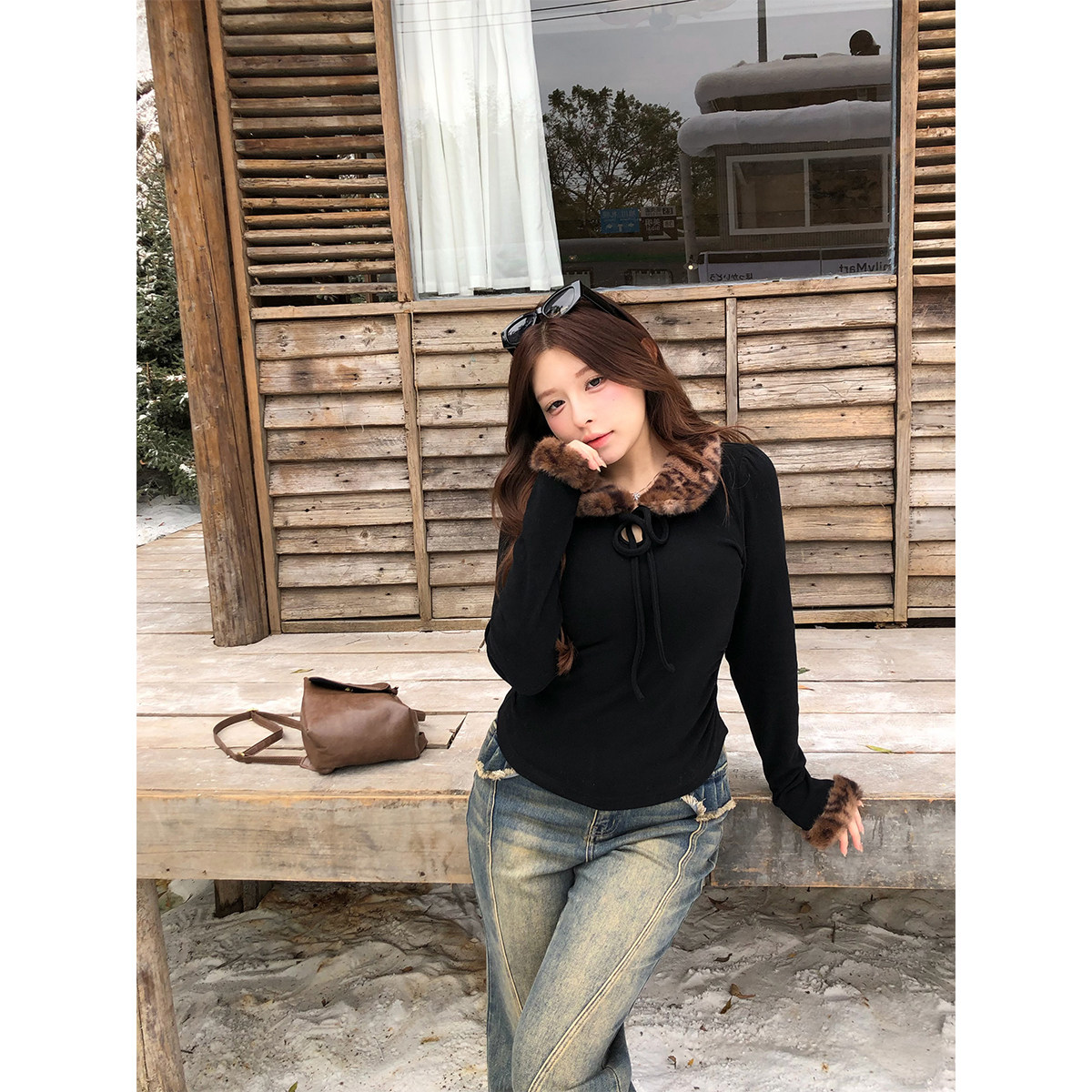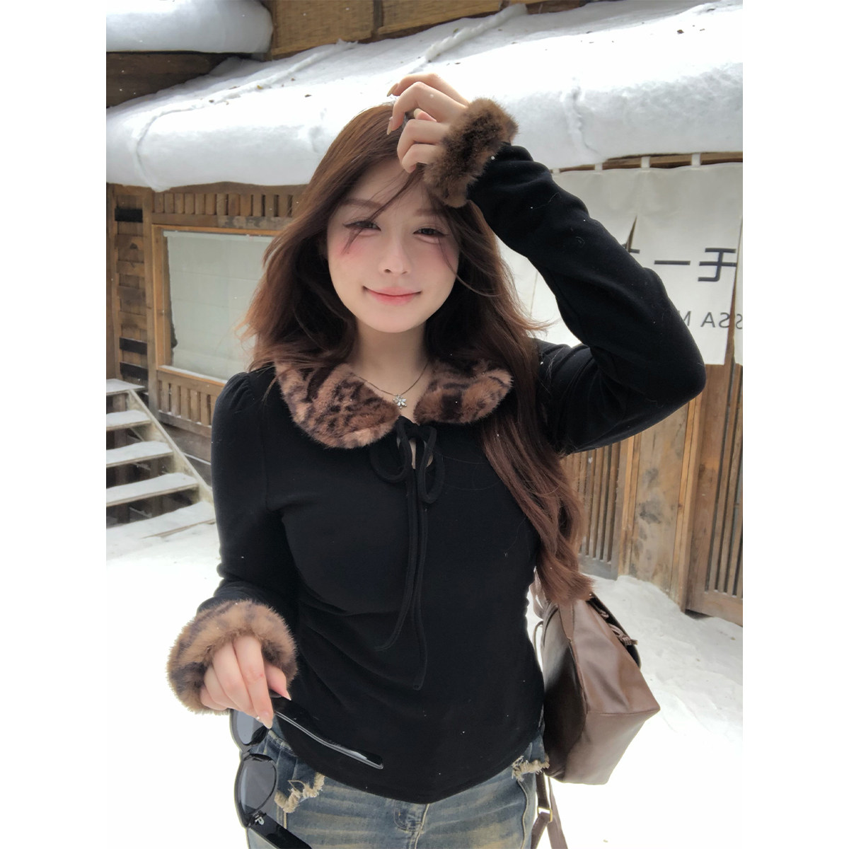 安妮不火 豹纹拼接高弹双面磨毛针织T恤女微胖大码绑带长袖上衣
