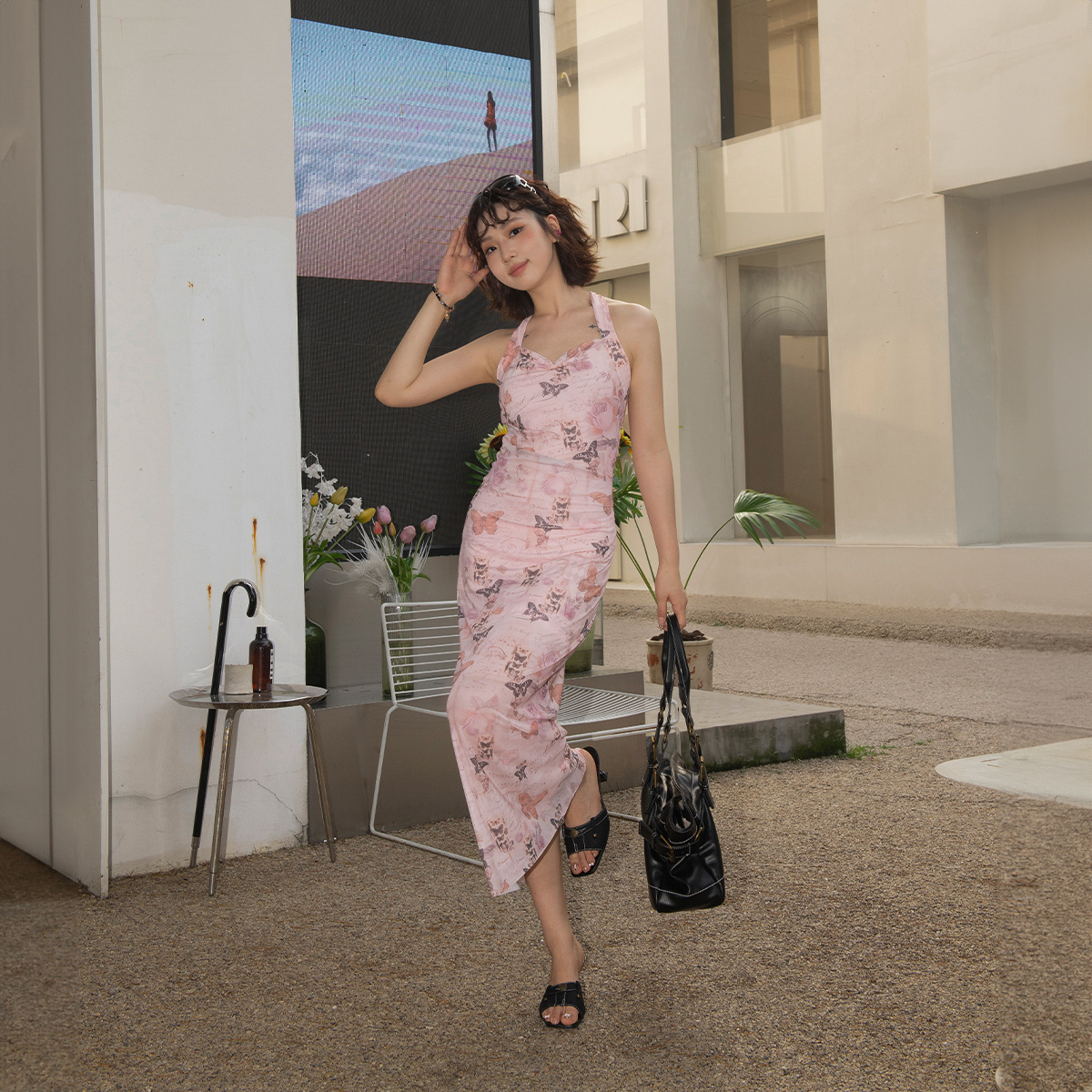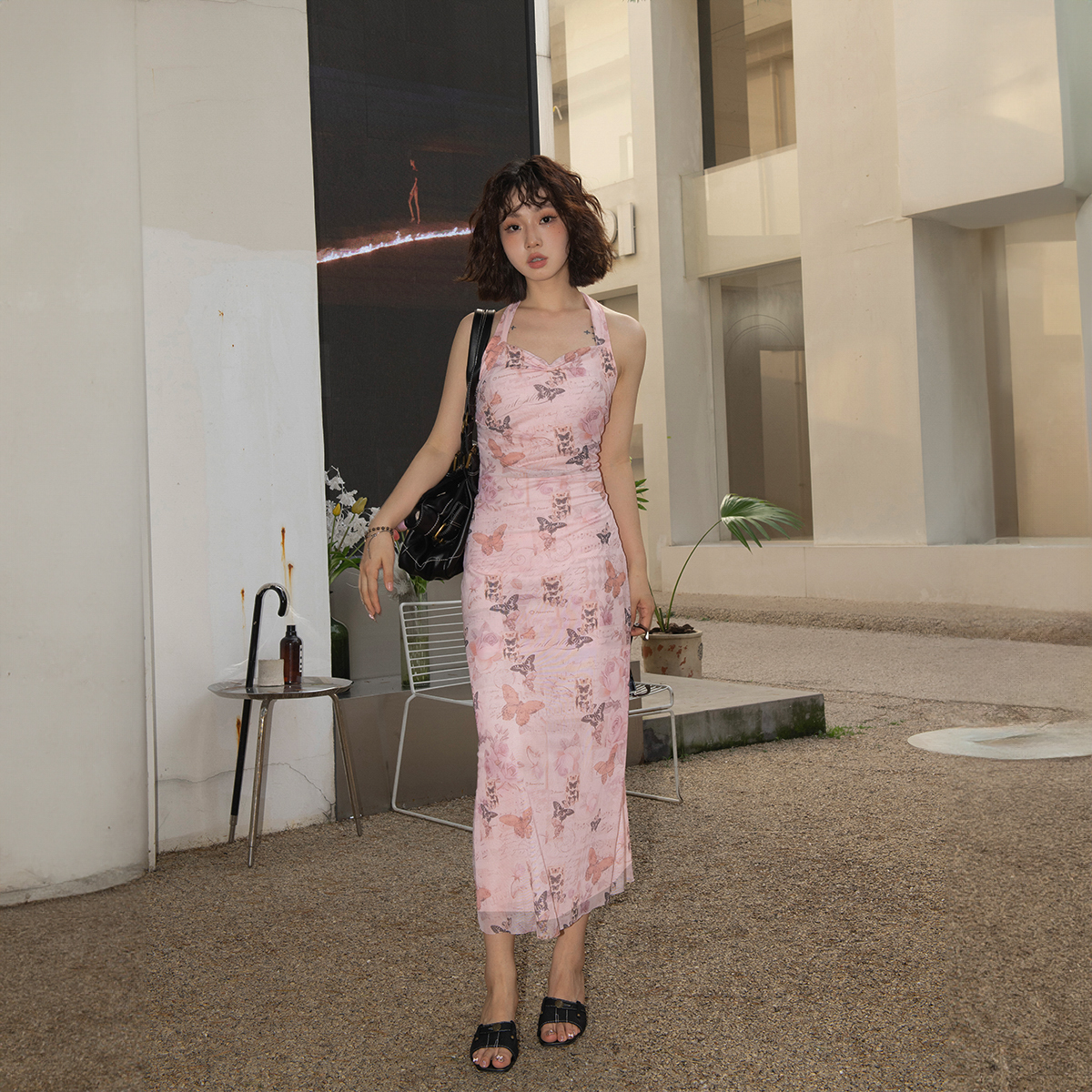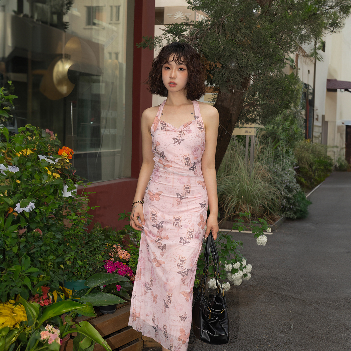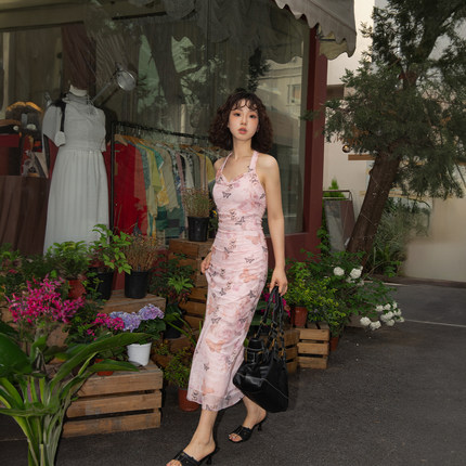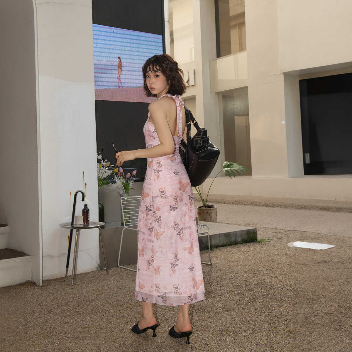 YEP粉色挂脖吊带连衣裙女夏季蝴蝶法式碎花小众长裙小众设计感