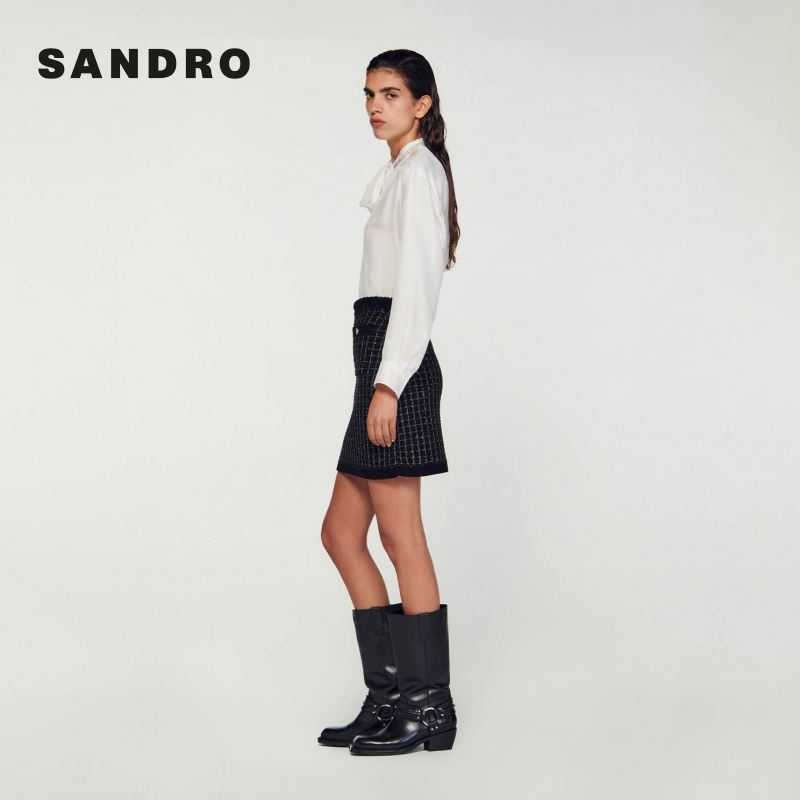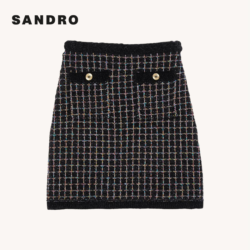 SANDRO Outlets秋冬女装经典时尚黑色格纹高腰花呢针织半身短裙