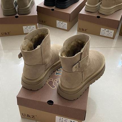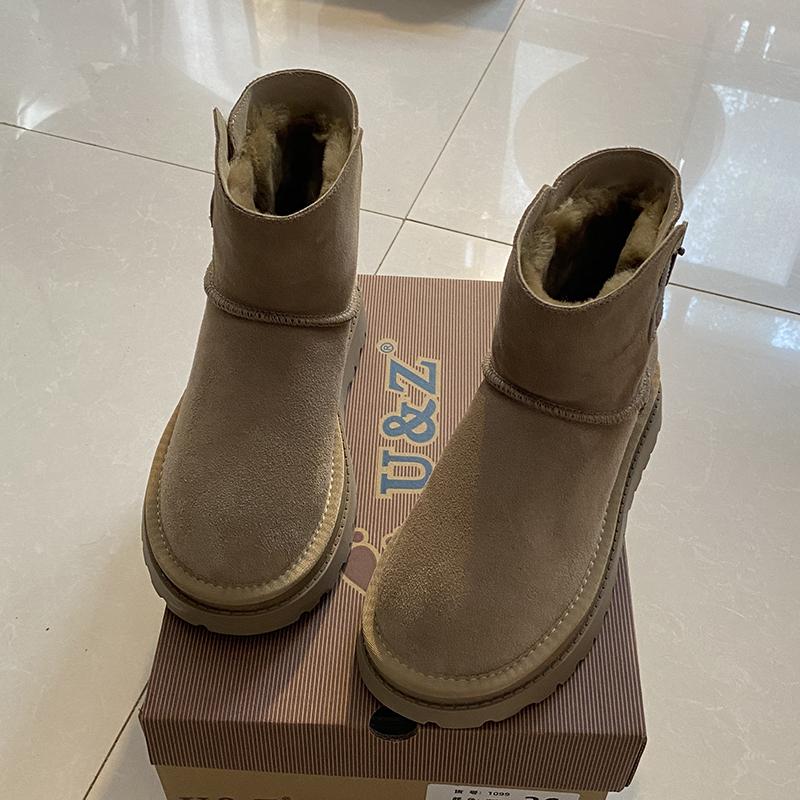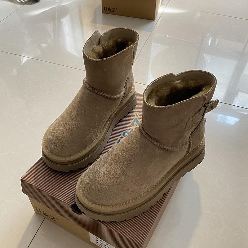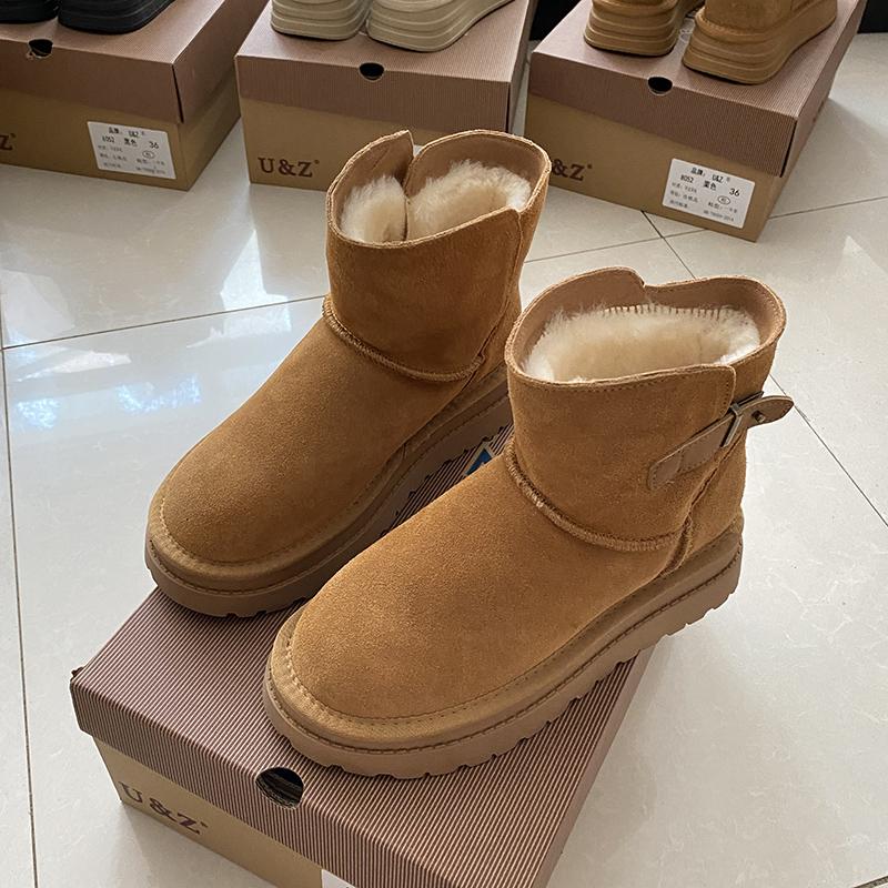 2024秋冬新款真皮保暖靴子小皮边雪地靴女短筒靴厚底欧美款皮靴潮