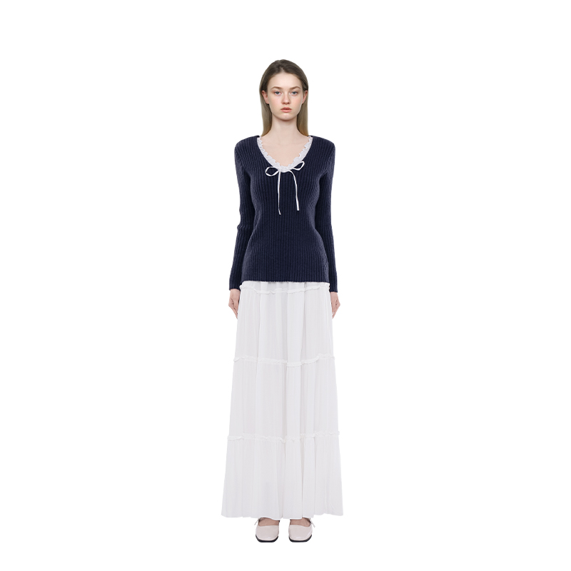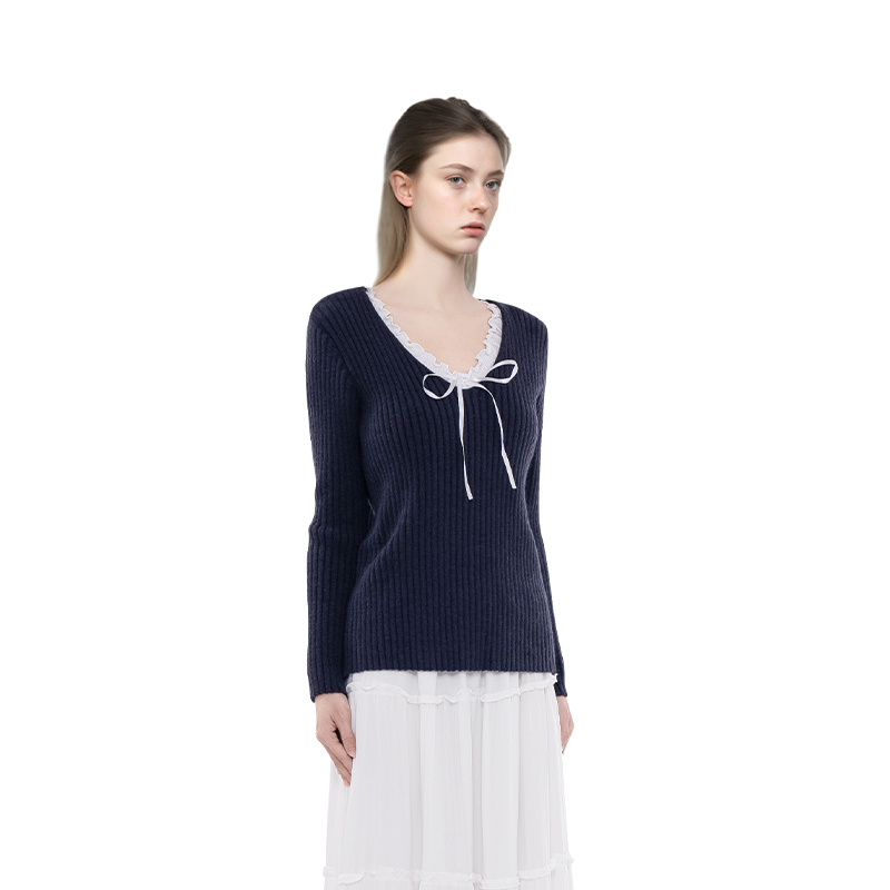 BM针织V领长袖毛衣女2025新款爆款秋季 条纹纹理藏青色外穿毛衣