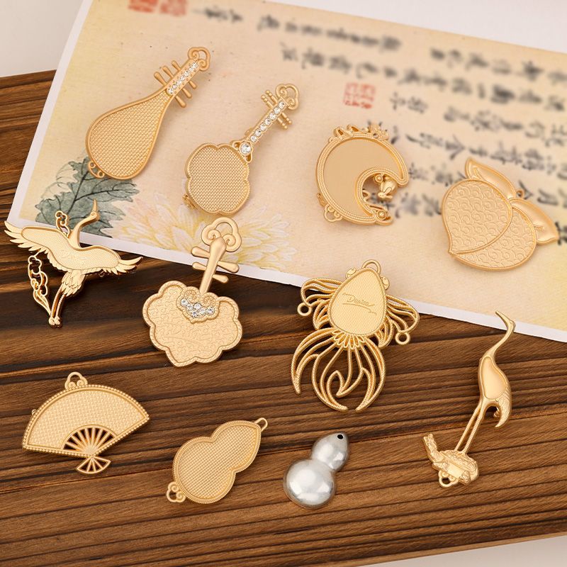 古风宋锦刺绣底托包布贴皮螺钿点翠古风仙鹤桃子琵琶锦鲤胸针