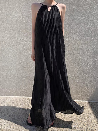 韩国chix夏季法式高级感立体褶皱设计感宽松长款挂脖吊带连衣裙女