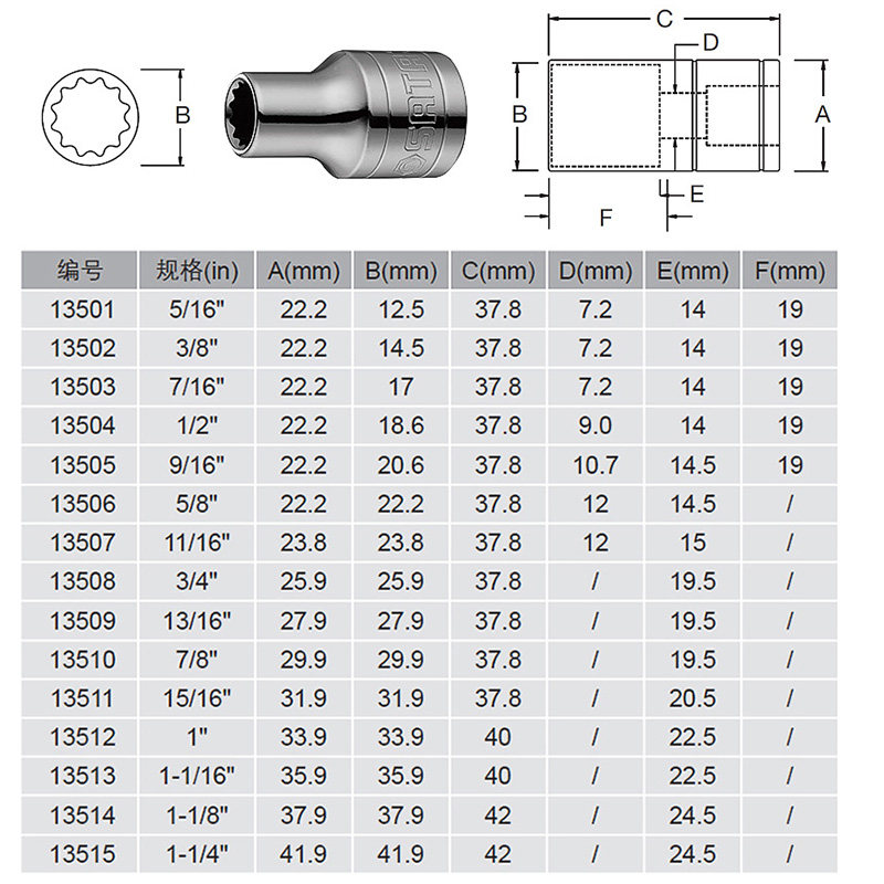 世达英制大飞套筒12.5mm梅花重型12角套筒头1/2花键工具套管套筒