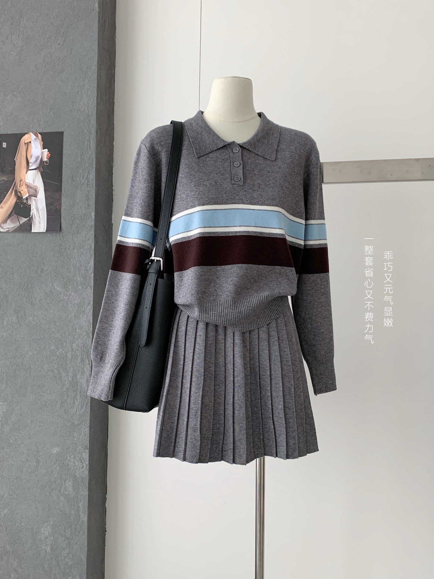 韩系复古运动风半扣Polo领条纹针织上衣+松紧腰百褶裙两件套装女