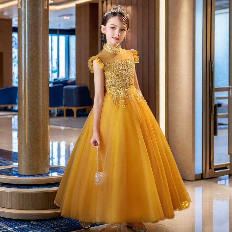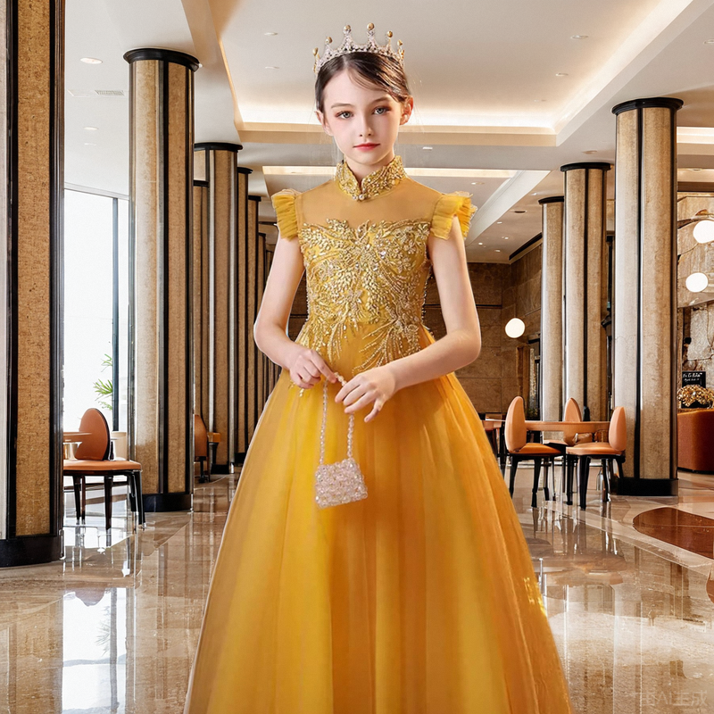比赛蓬蓬金色舞台女童礼服高端轻奢中童公主裙古筝婚纱裙子儿童夏
