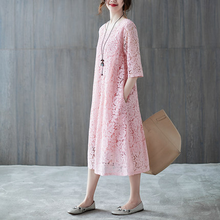 胖仙女大码女装遮肉蕾丝连衣裙女中袖夏季2023新款气质显瘦长裙子