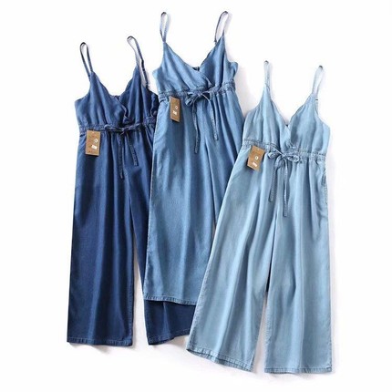 外贸女装2019夏季新款韩版天丝牛仔阔腿连衣裤抽绳收腰显瘦背带裤