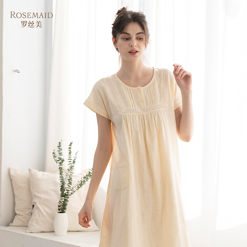 Rosemaid/罗丝美睡裙夏季女款圆领套头短袖纯棉双层纱半开襟12026