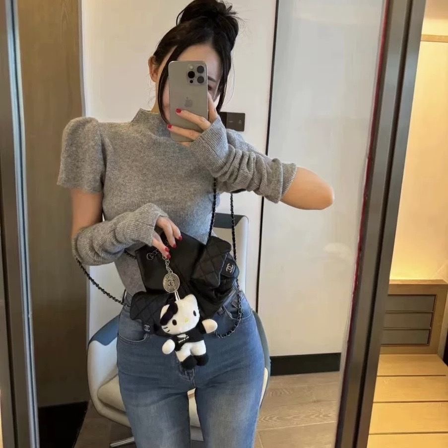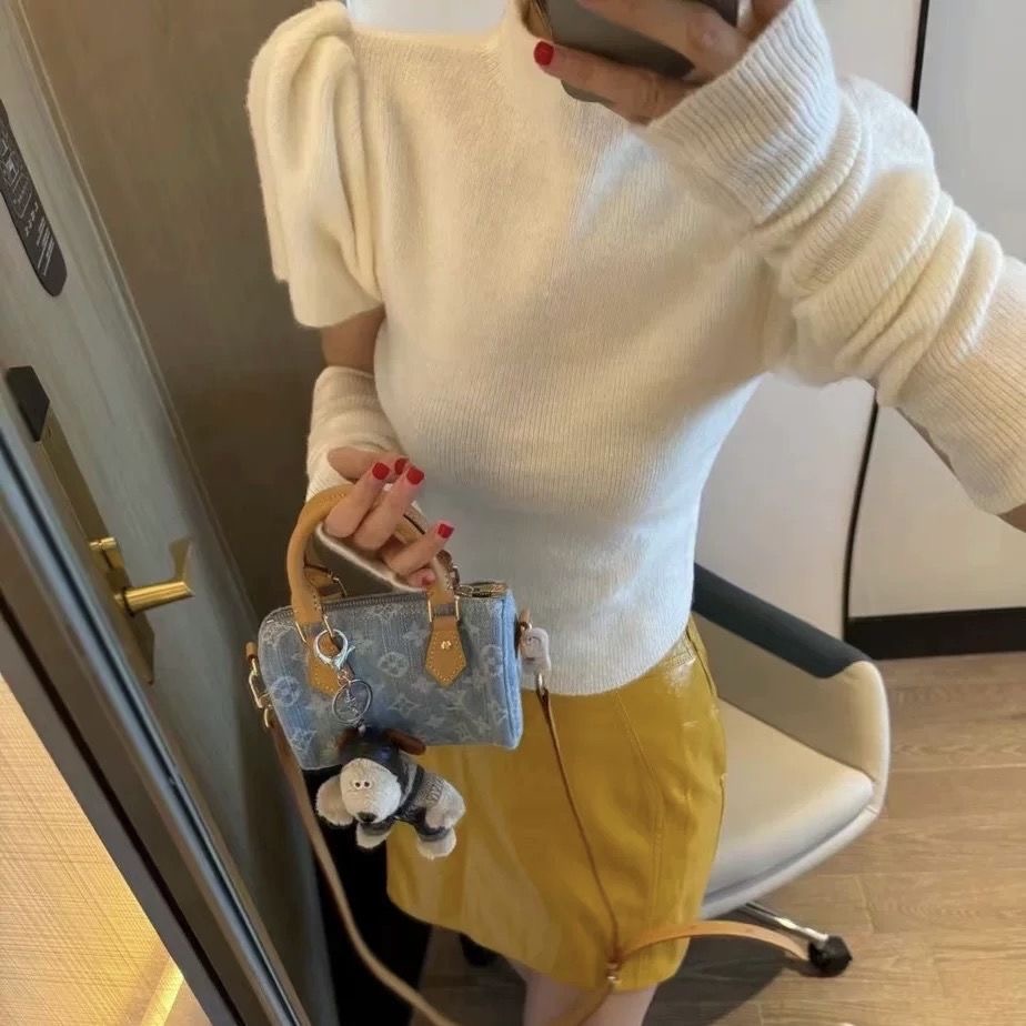 2025秋季新款圆领泡泡袖针织衫女纯色毛衣配袖套气质显瘦短款上衣