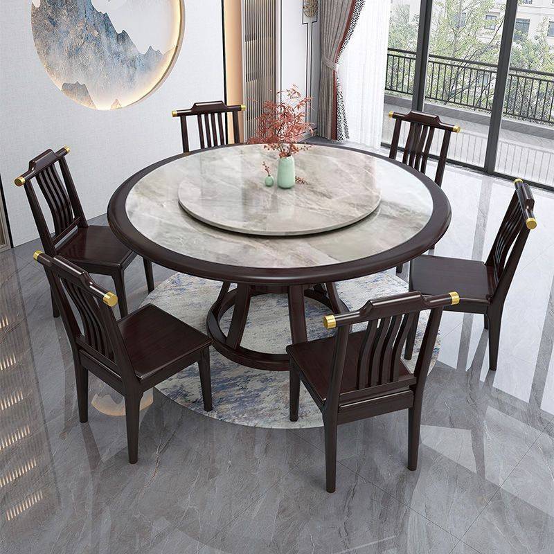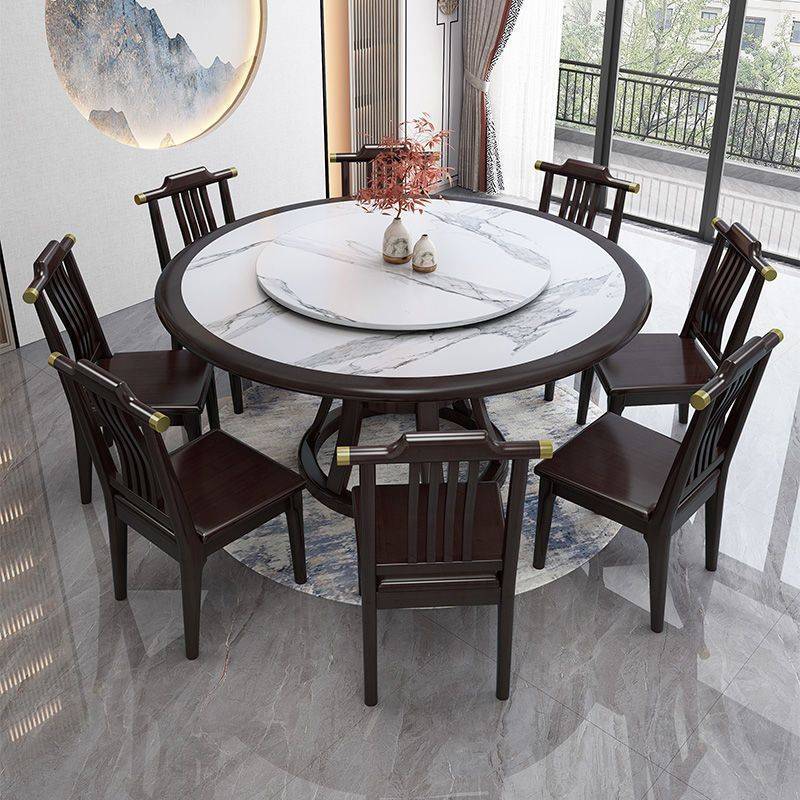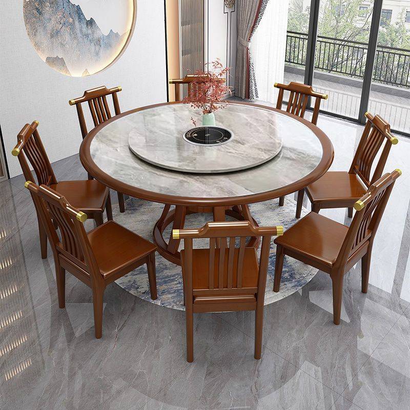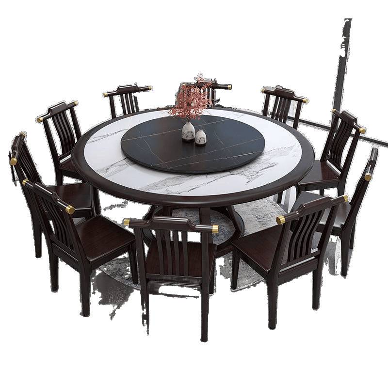 新中式实木岩板餐桌椅组合现代简约家用带转盘饭店电磁炉大圆桌子