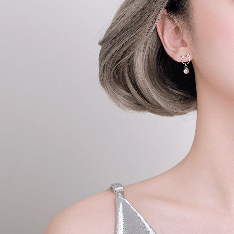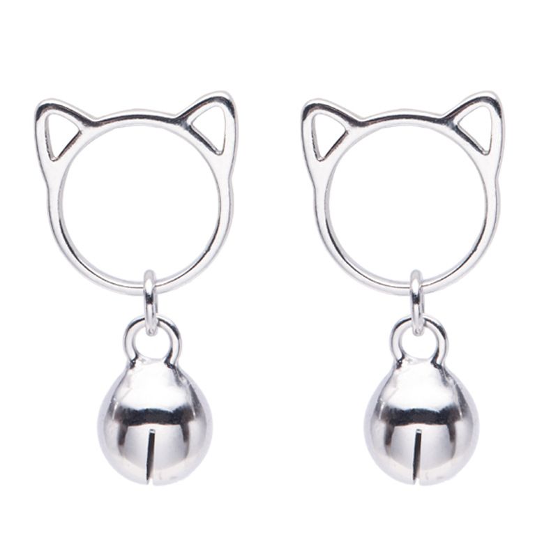 s925纯银猫咪耳钉可爱铃铛短款耳坠气质个性精致耳环韩国简约饰品