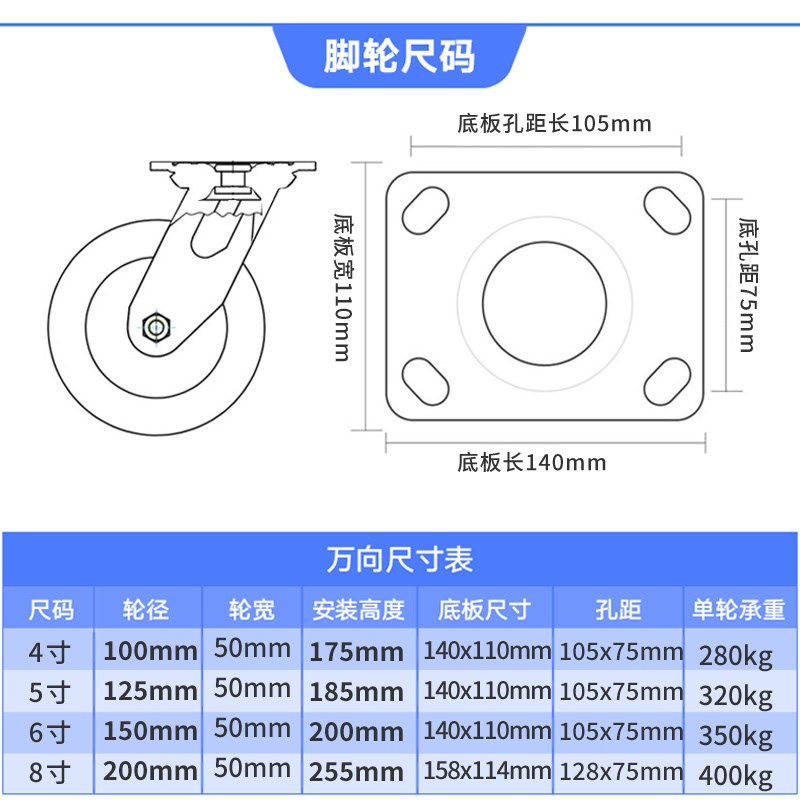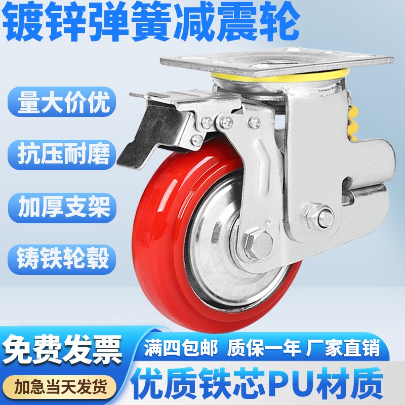 重型弹簧减震4寸5寸脚轮6寸8寸pu轮耐磨避震地刹器牵引铁芯大门轮