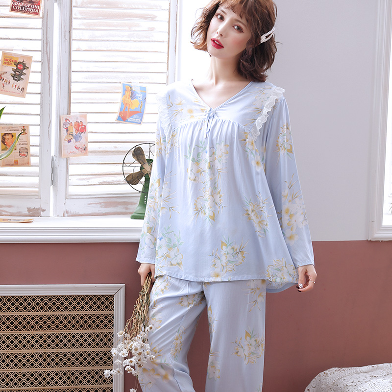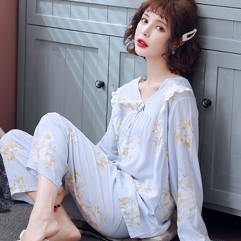 可爱夏季人造棉绸睡衣女士薄款长袖两件套装春秋季长裤绵绸家居服