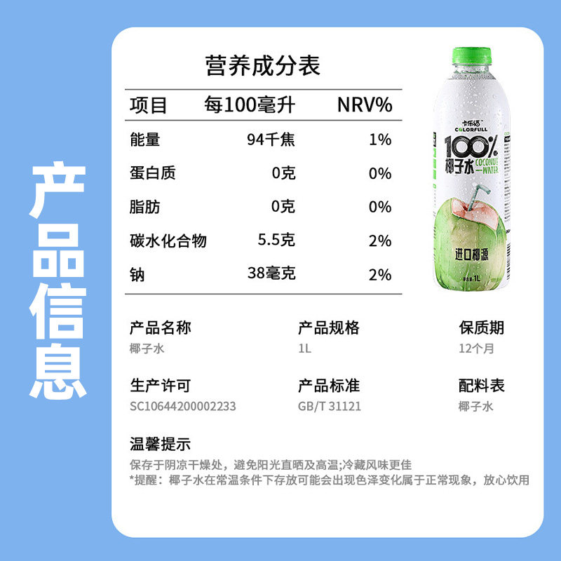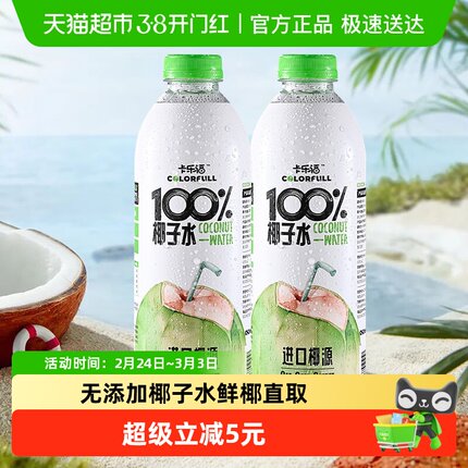 卡乐福100%椰子水1000mlx2瓶无添加椰青果汁补水健身电解质水饮料