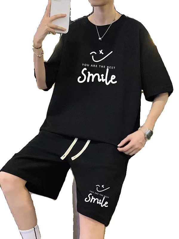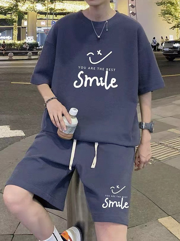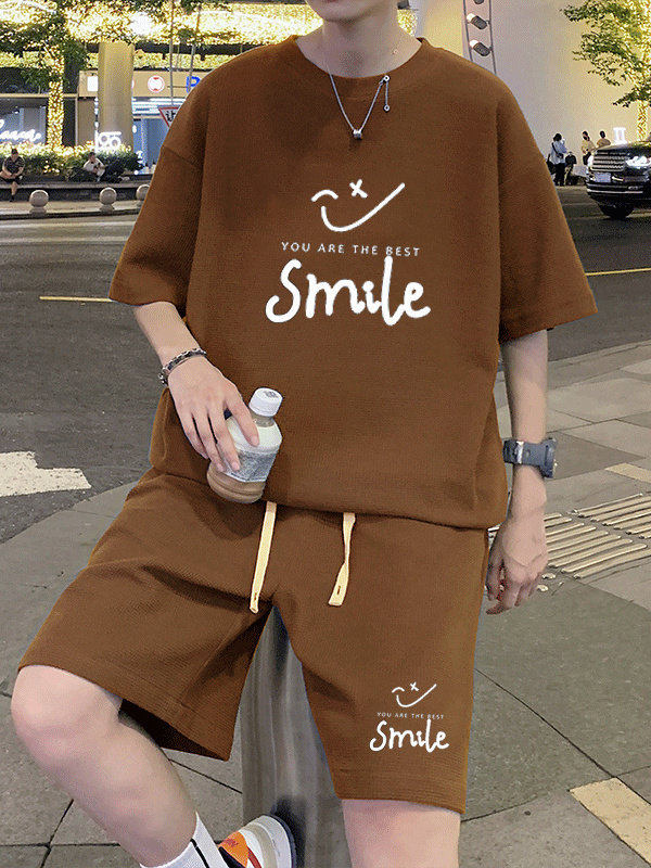 青少年华夫格短裤休闲套装夏季短袖t恤男港风宽松运动五分中裤子