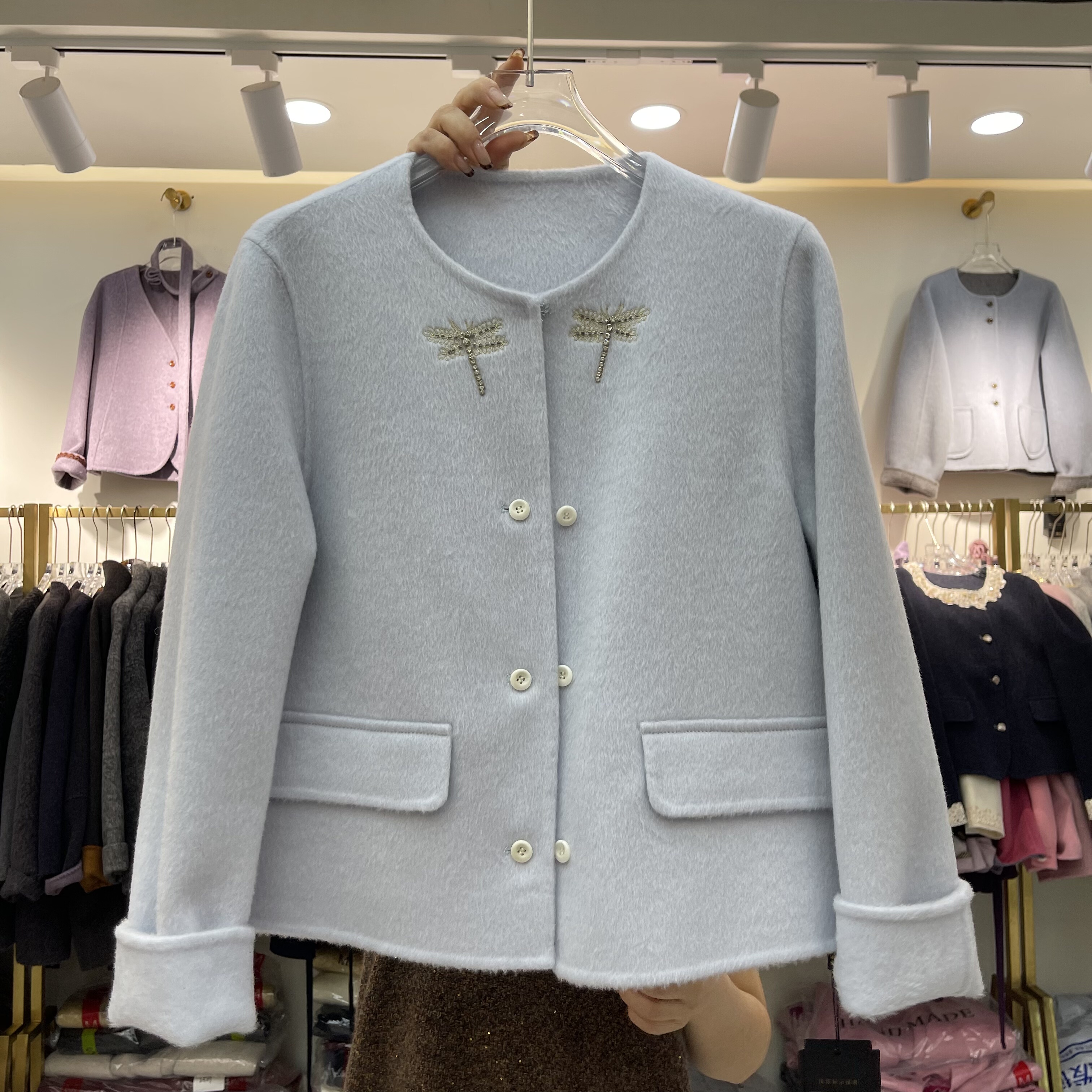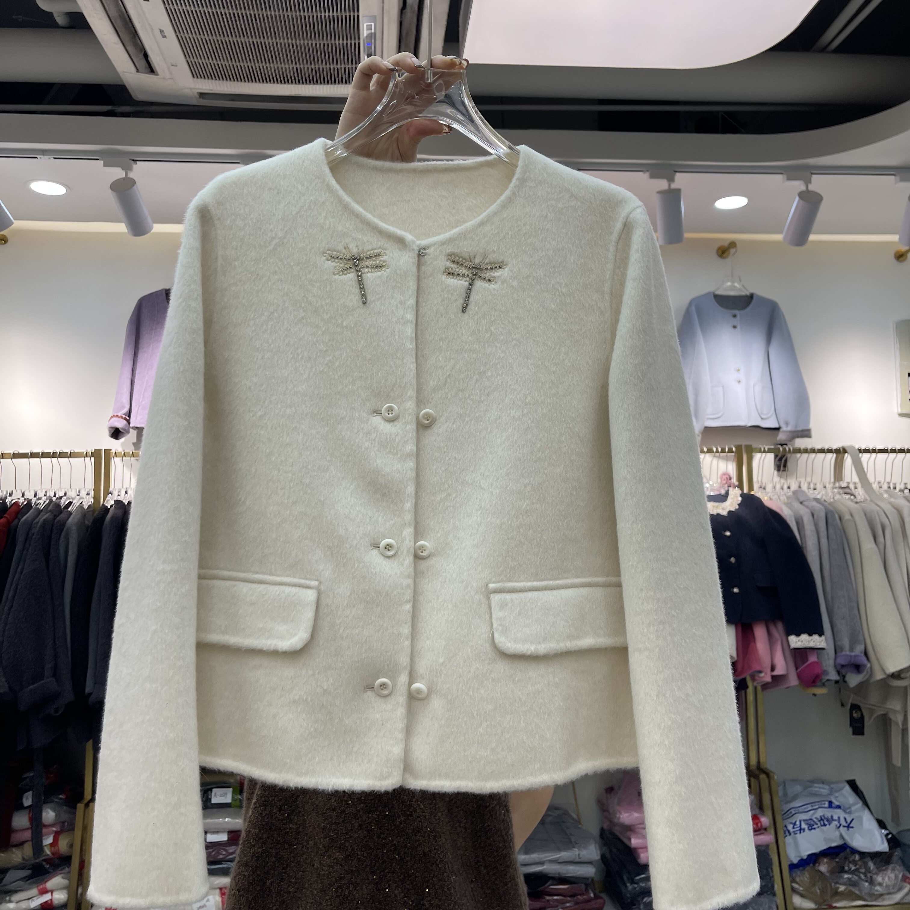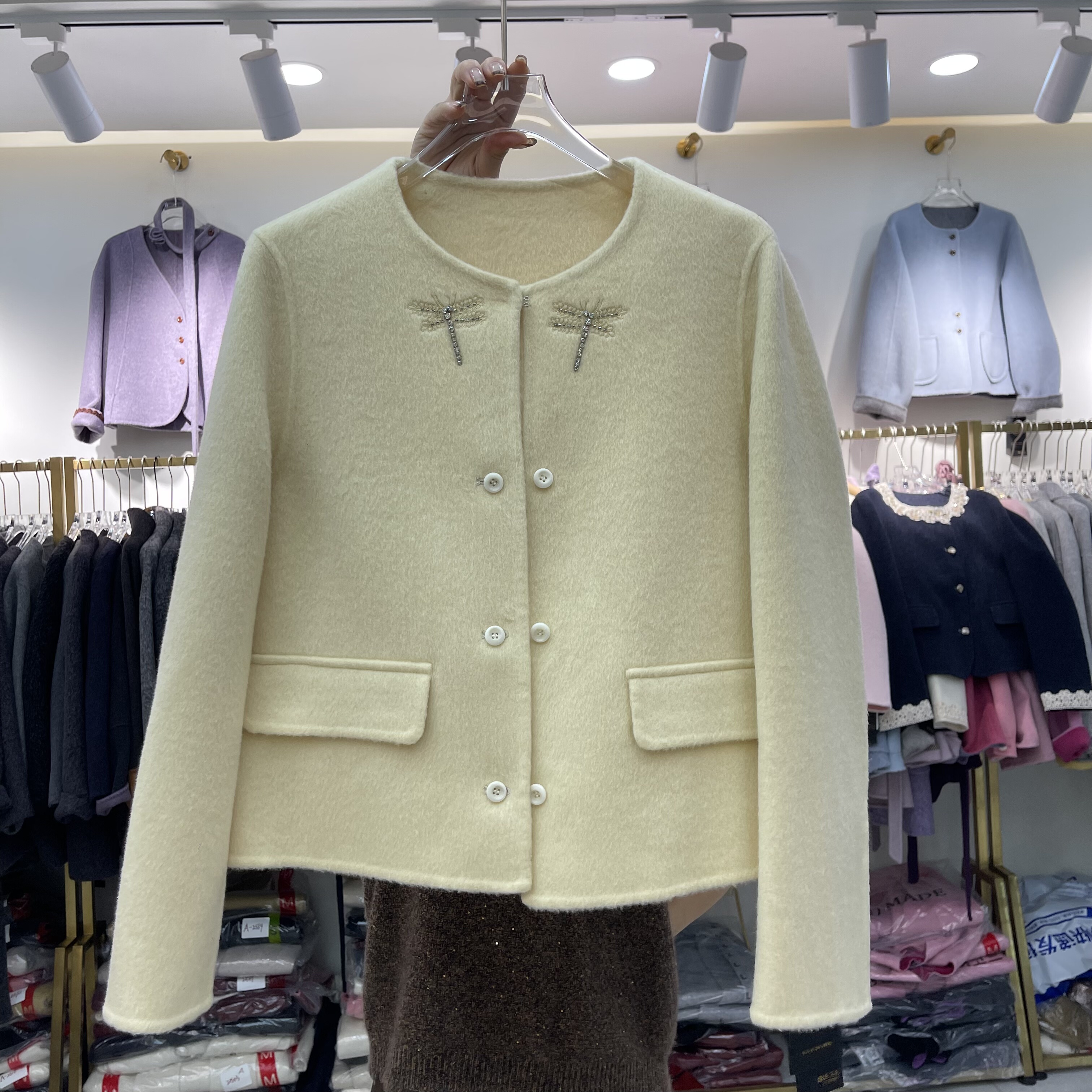 钉珠小蜻蜓双面羊毛大衣女2025秋冬新款韩版短款女修身羊毛呢外套