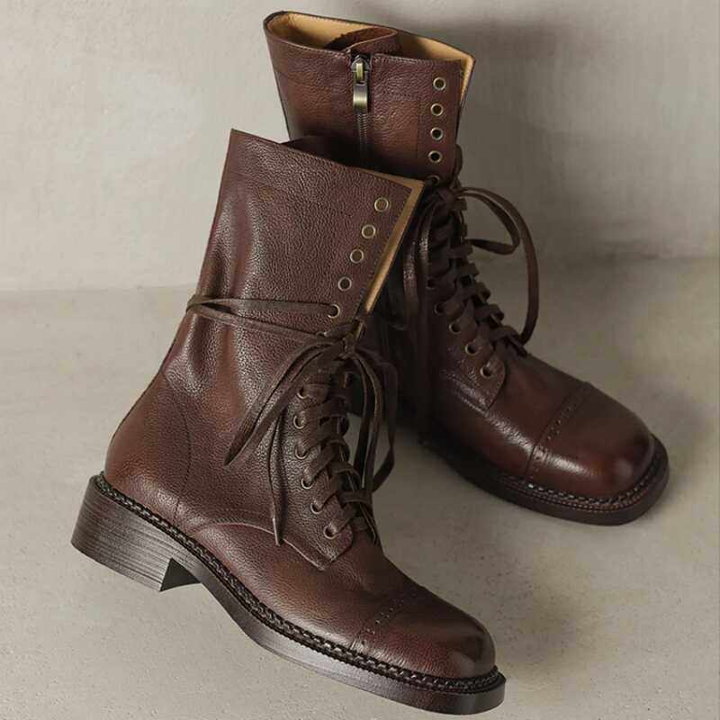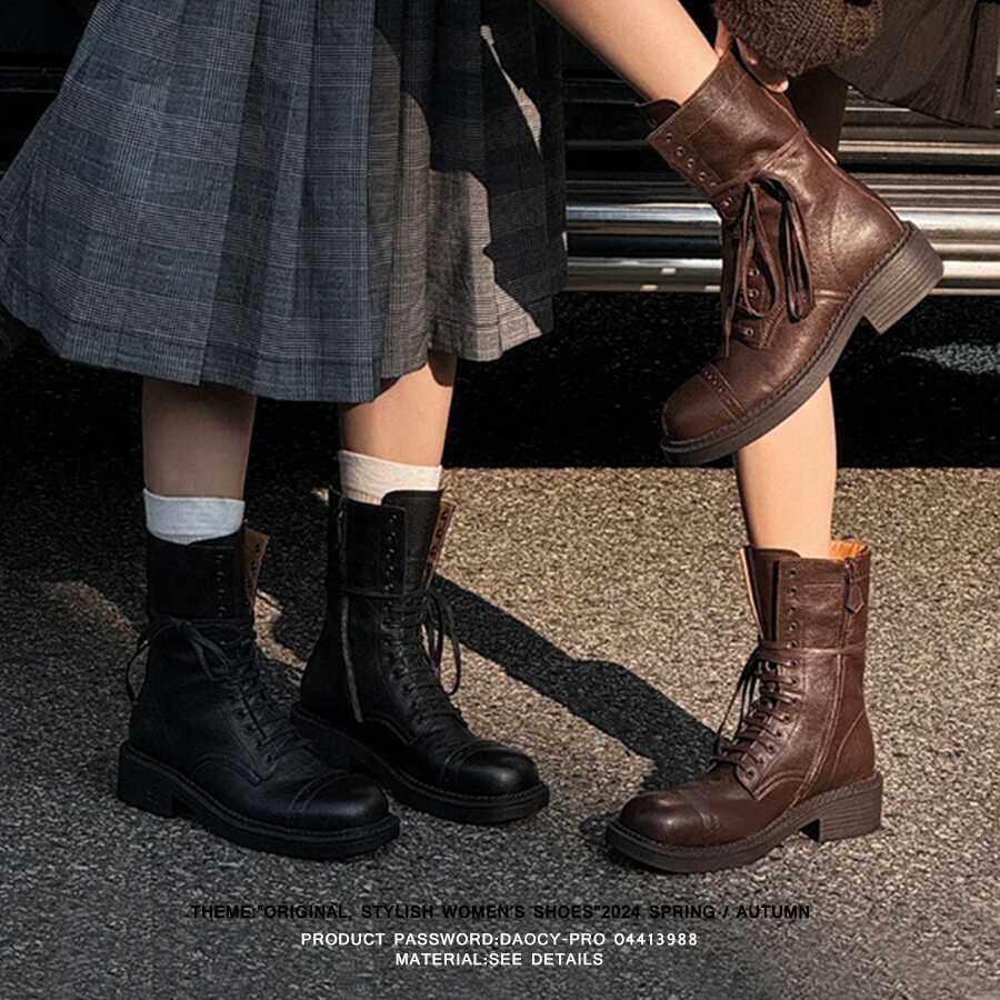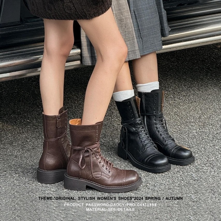 真皮英伦风马丁靴女2025春新款美拉德粗跟短靴系带中筒西部牛仔靴