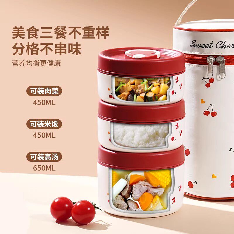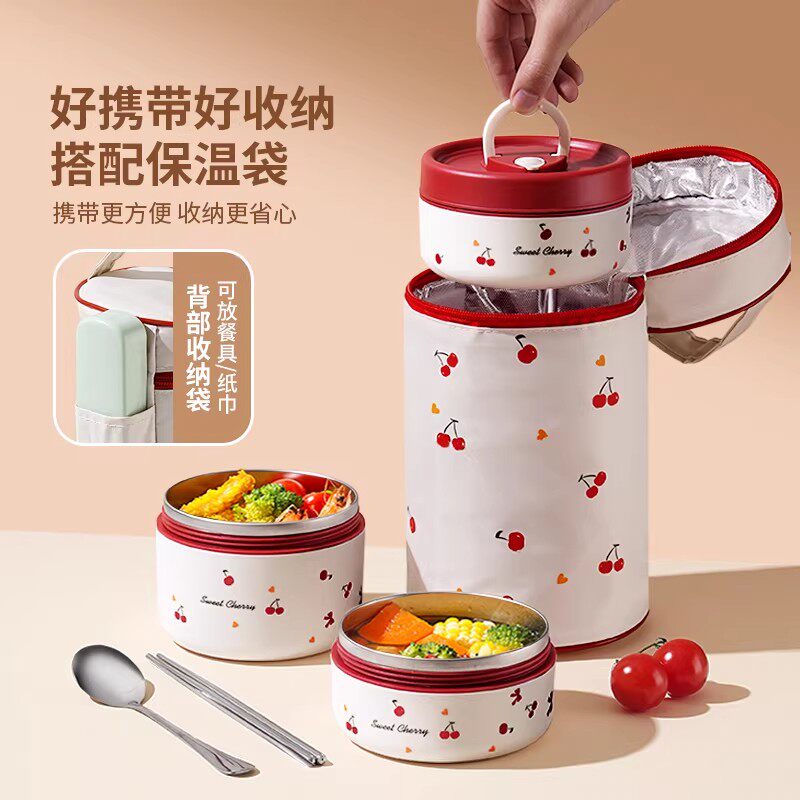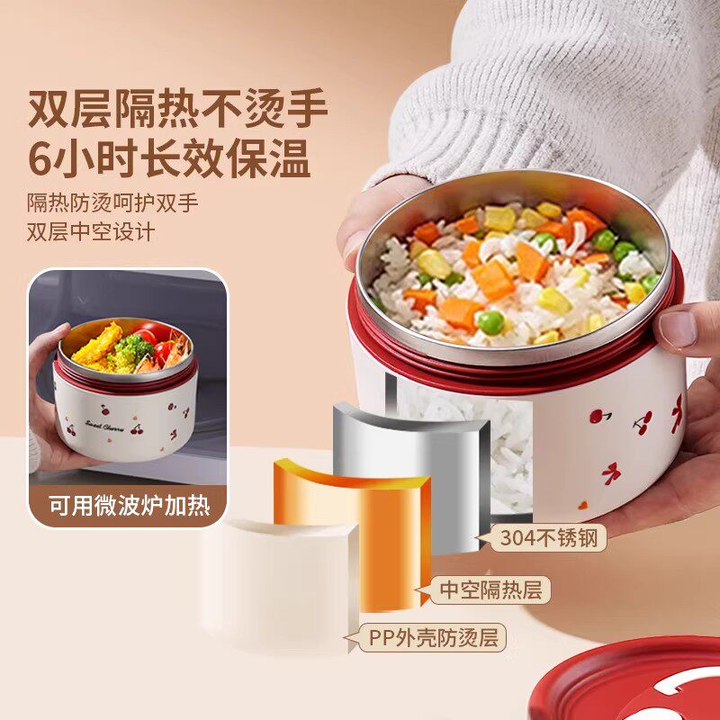 日本新款可爱式保温饭盒通用双层便携抗菌小清新樱桃笑脸保温饭盒