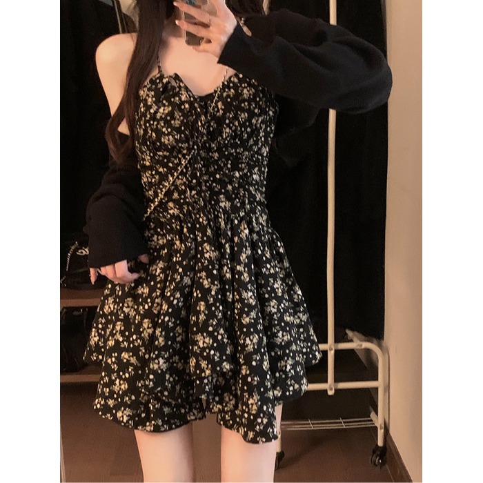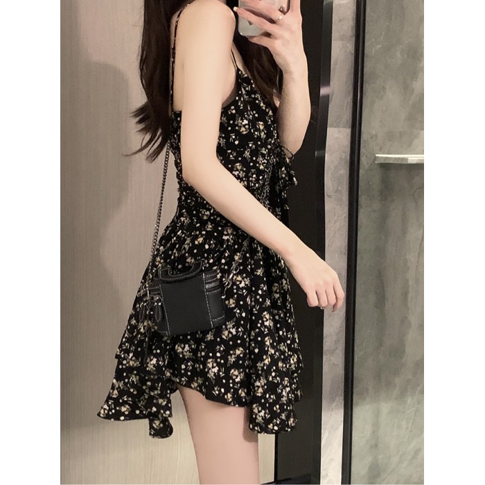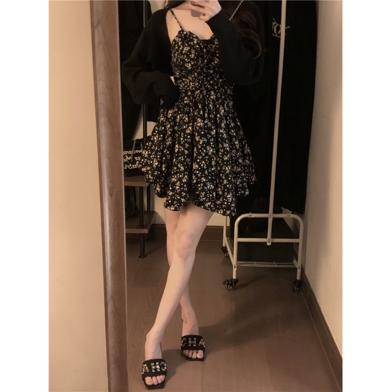 法式V领黑色碎花吊带连衣裙女夏季外搭开衫不规则收腰短裙A字裙子