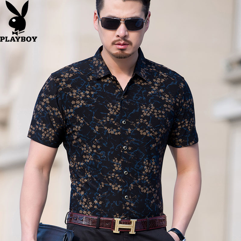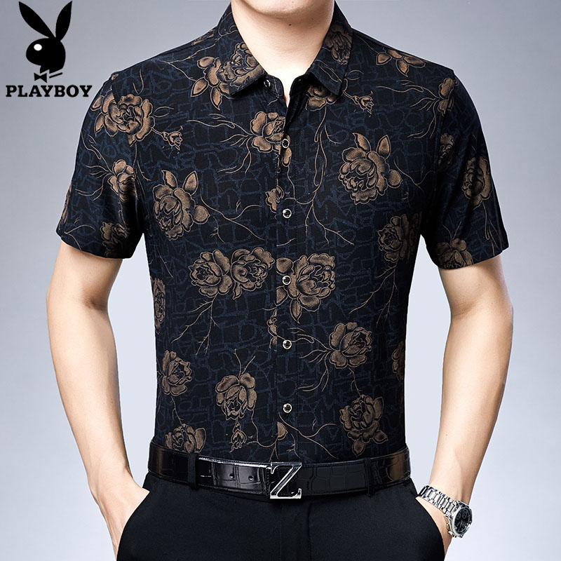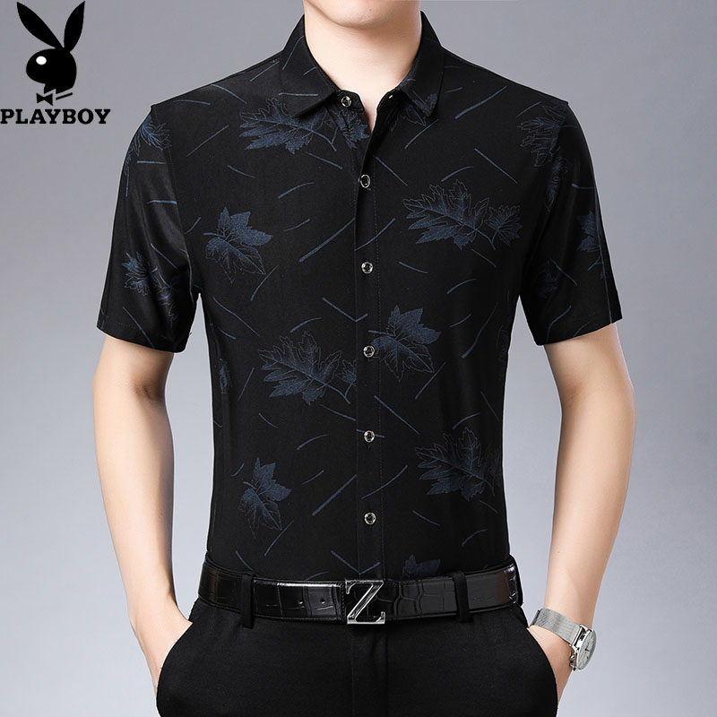 花花公子花衬衫男短袖夏季印花弹力宽松中年人爸爸装夏天男士衬衣