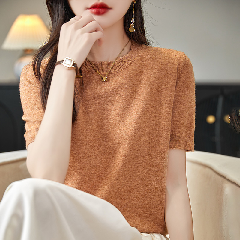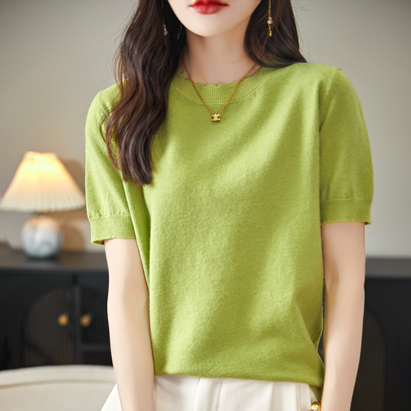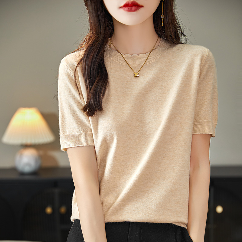 2025春秋新款圆领花边针织短袖女内搭打底夏季宽松大码精纺羊毛衫