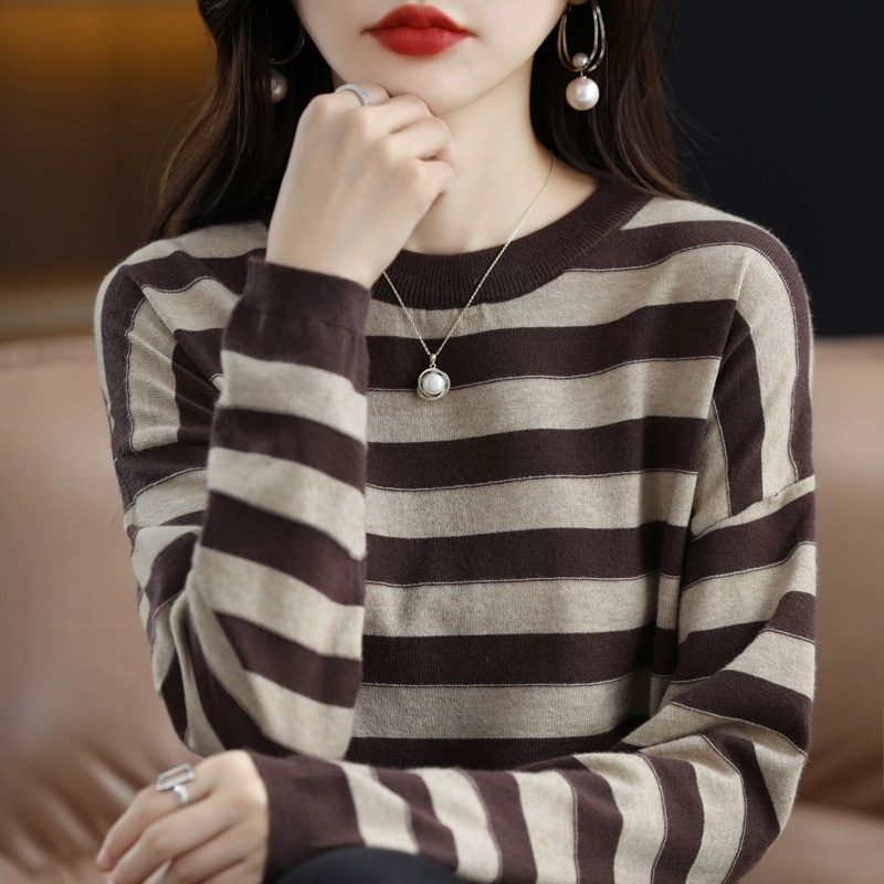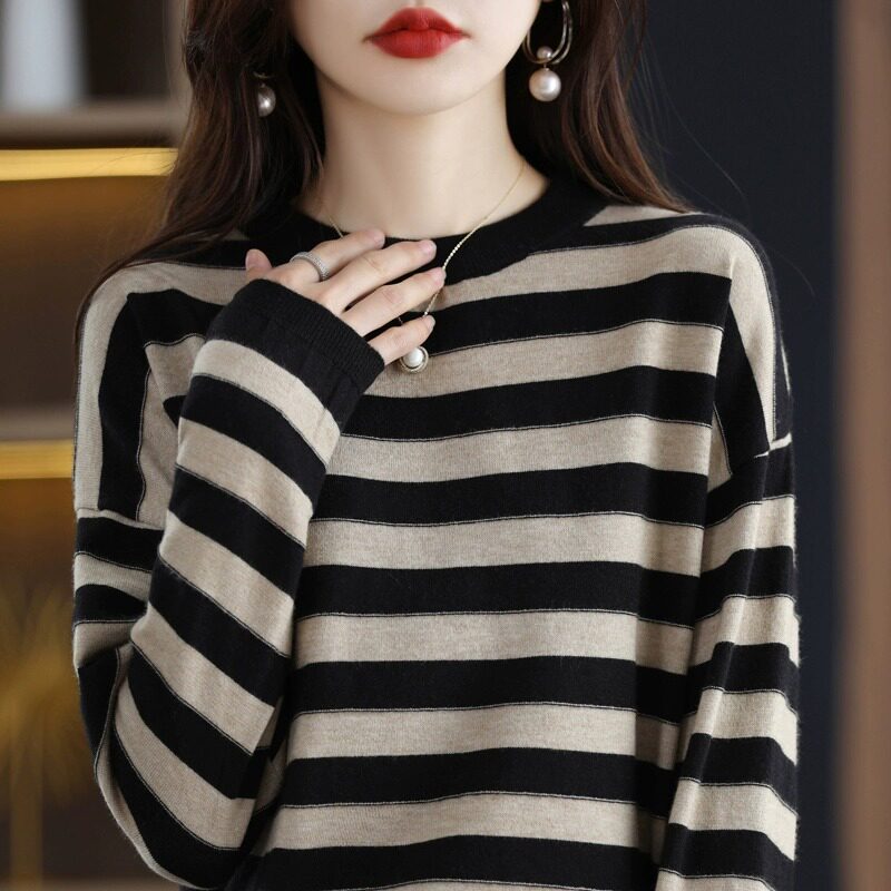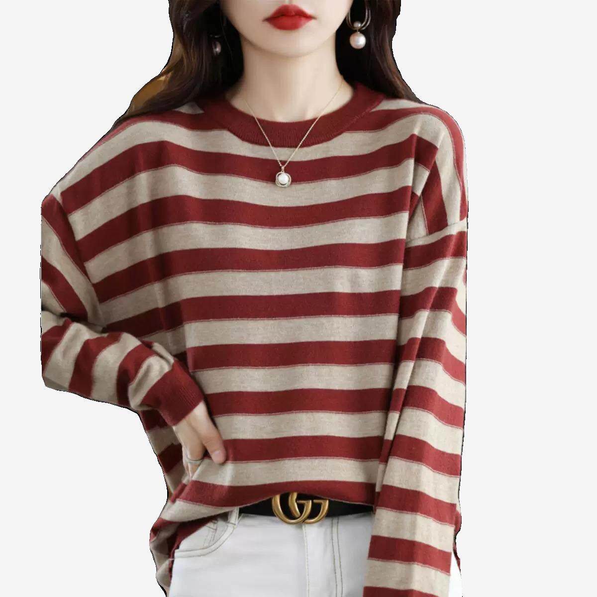 清仓羊绒衫条纹女秋冬上衣毛衣宽松圆领套头减龄内搭羊毛针织打底