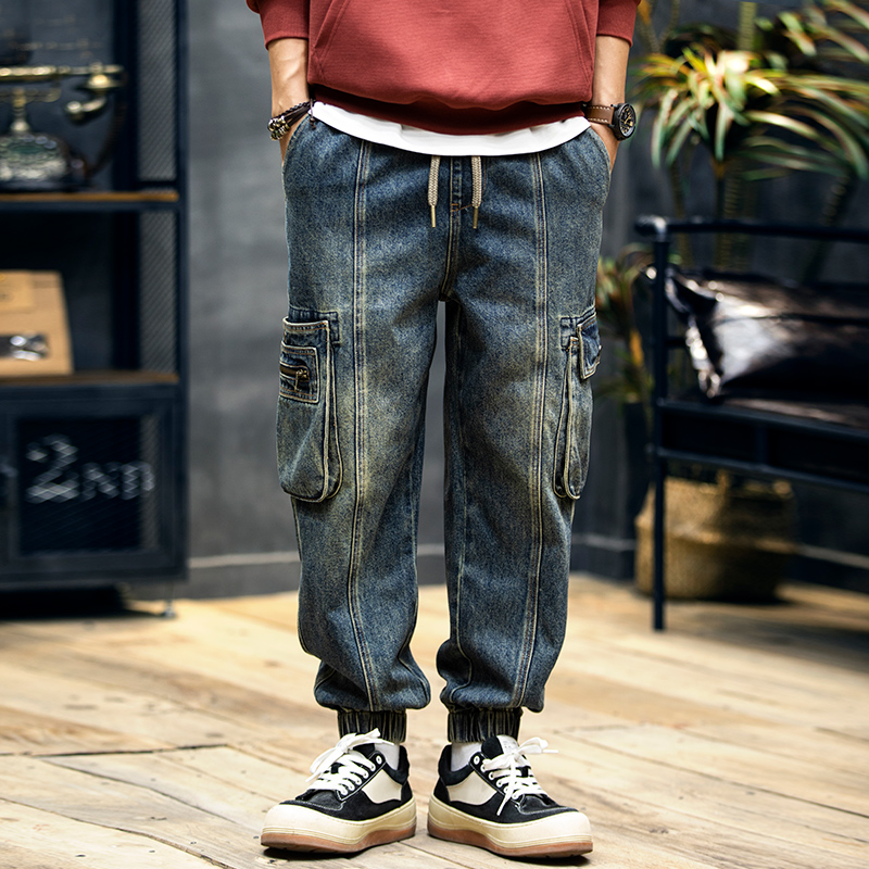 复古潮牌牛仔裤男士秋季宽松束脚大码男裤春秋款松紧腰工装裤子男