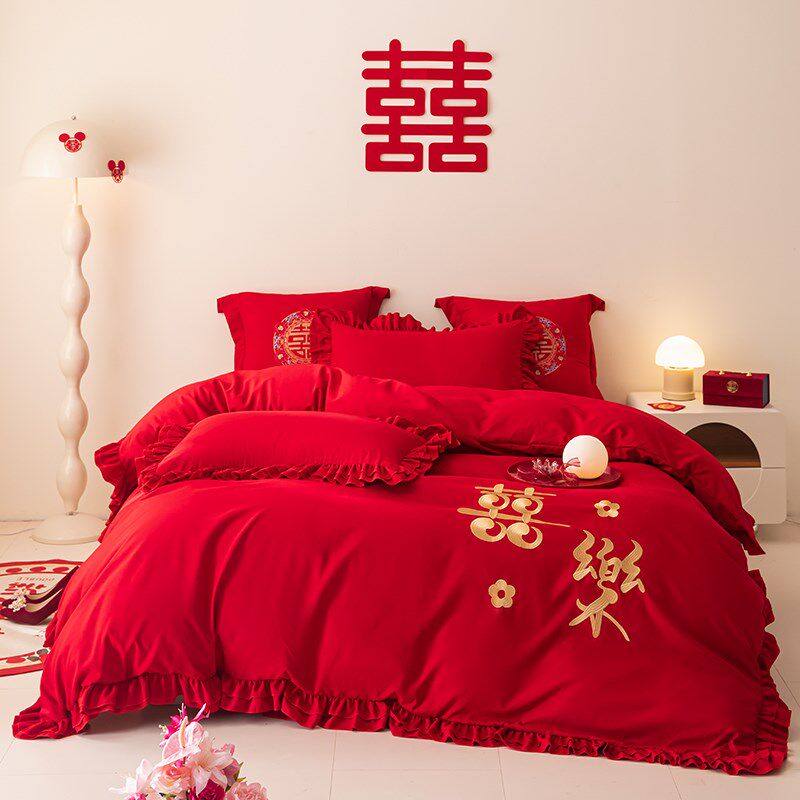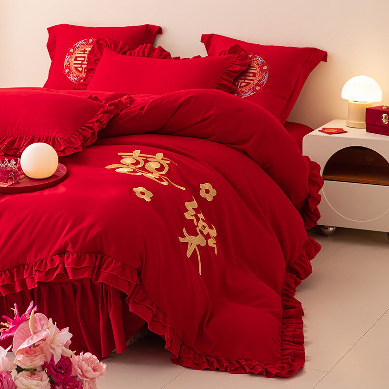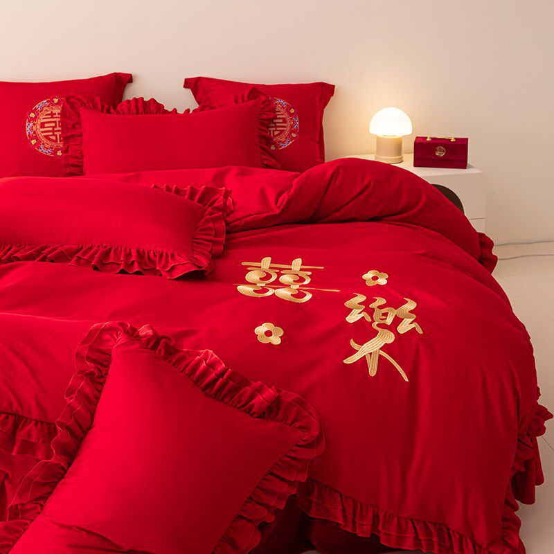 中式大红色结婚床裙四件套花边床单被罩婚庆被套喜被新.娘陪嫁床