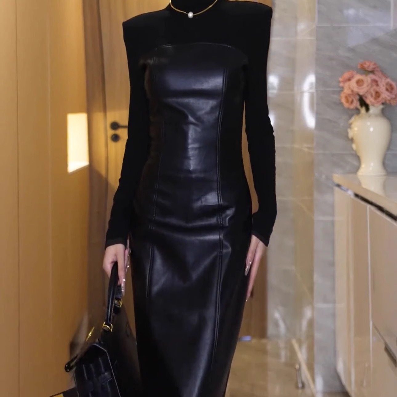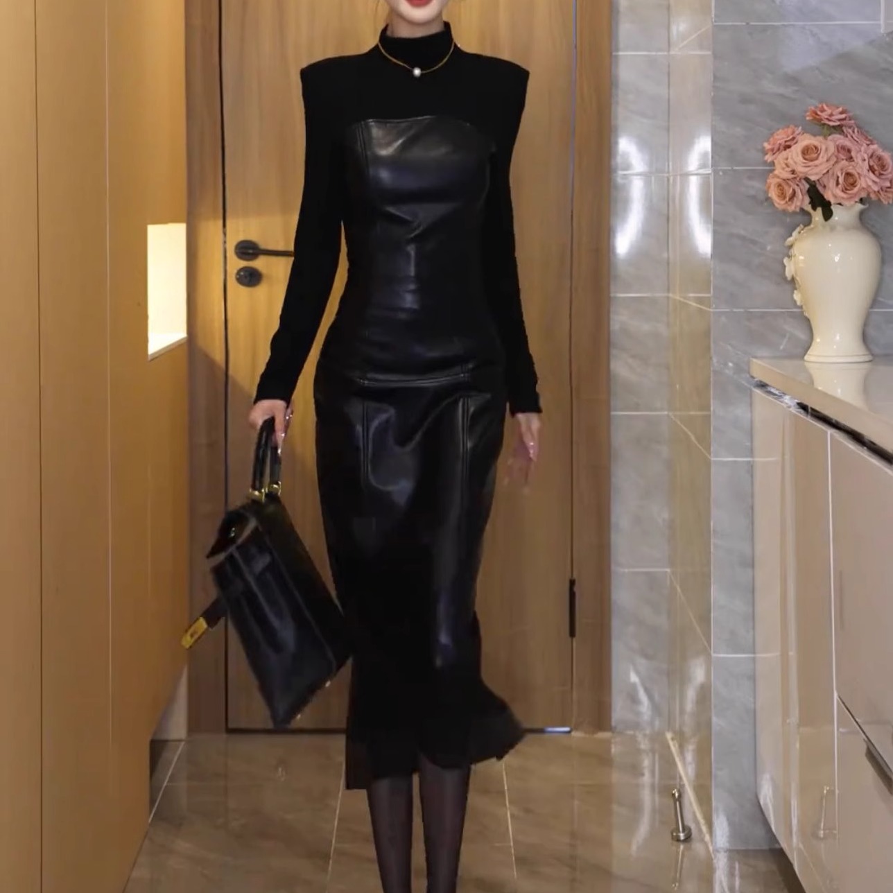 御姐高级感拼接皮裙连衣裙女2024秋冬气质时尚收腰包臀显瘦长裙潮