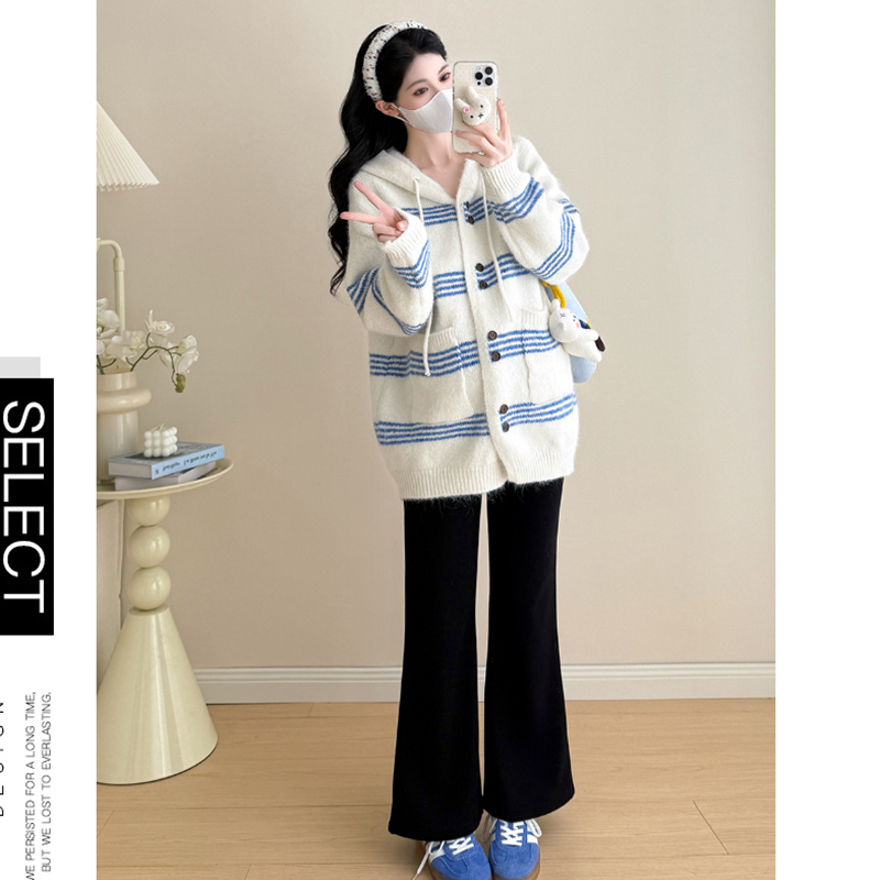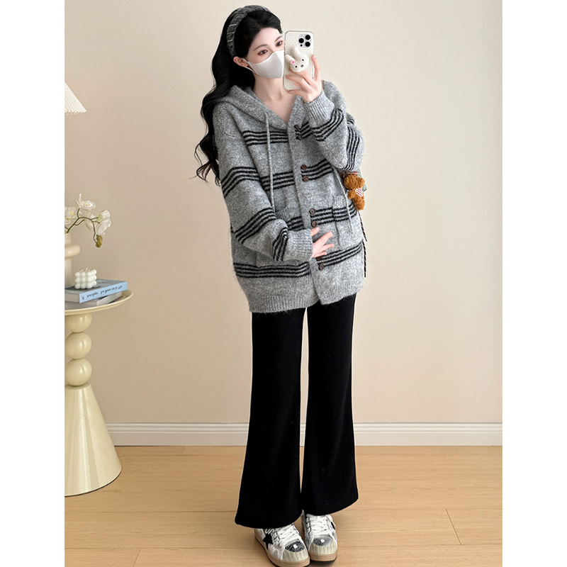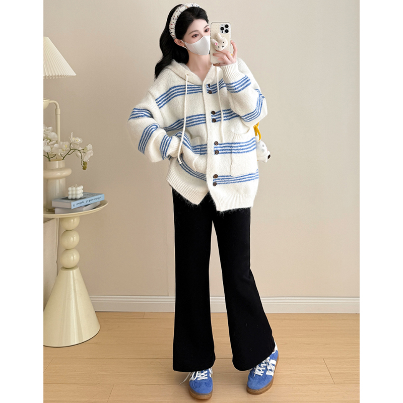 孕妇套装秋冬2025新款蓝色条纹毛衣连帽针织开衫上衣裤子两件套女