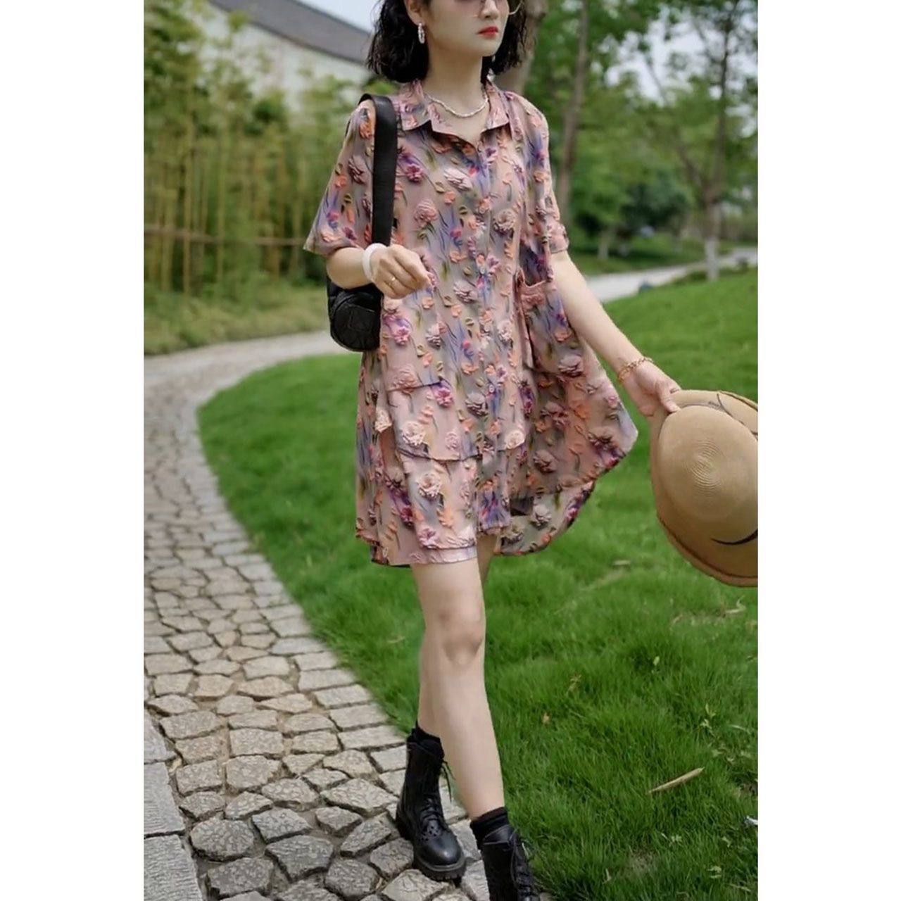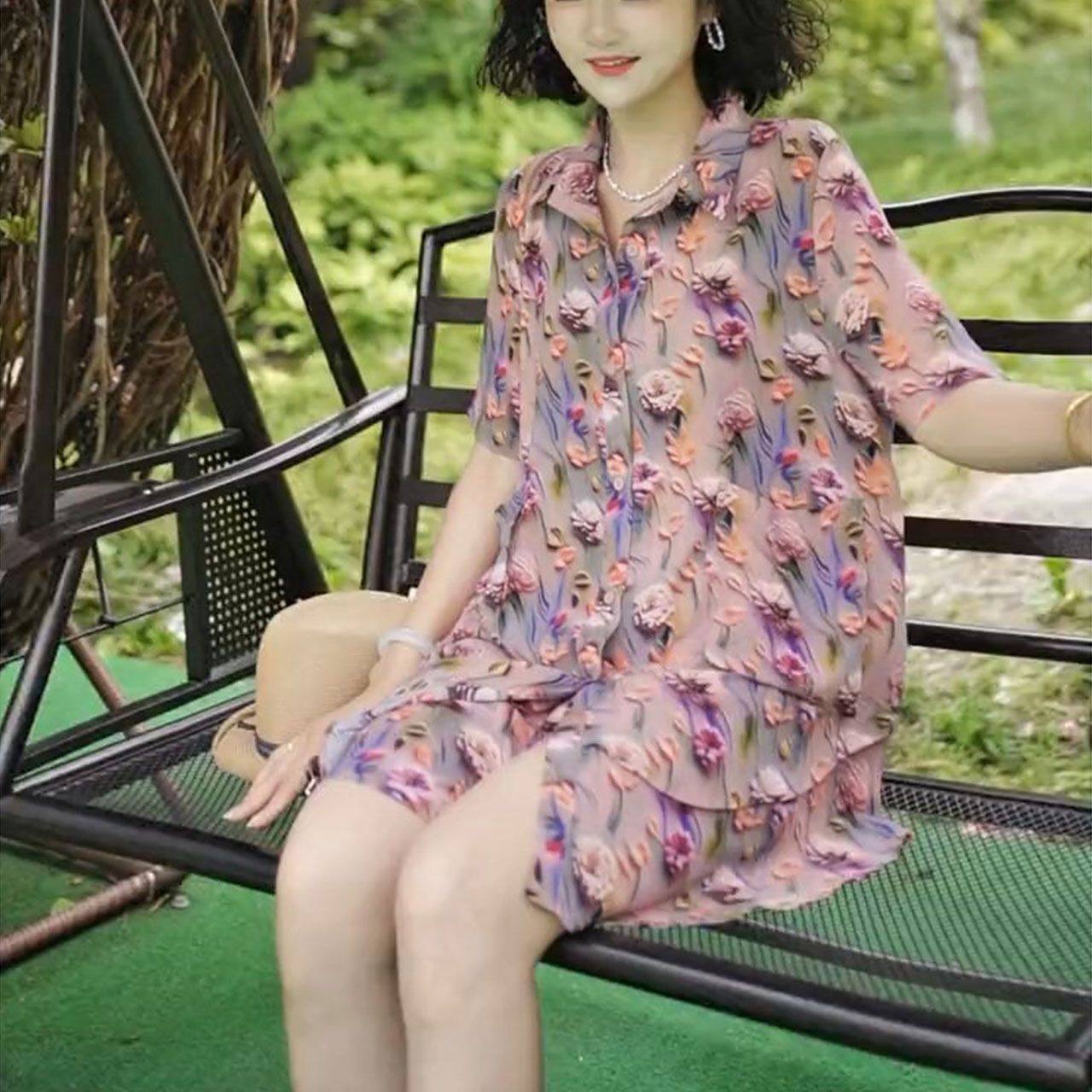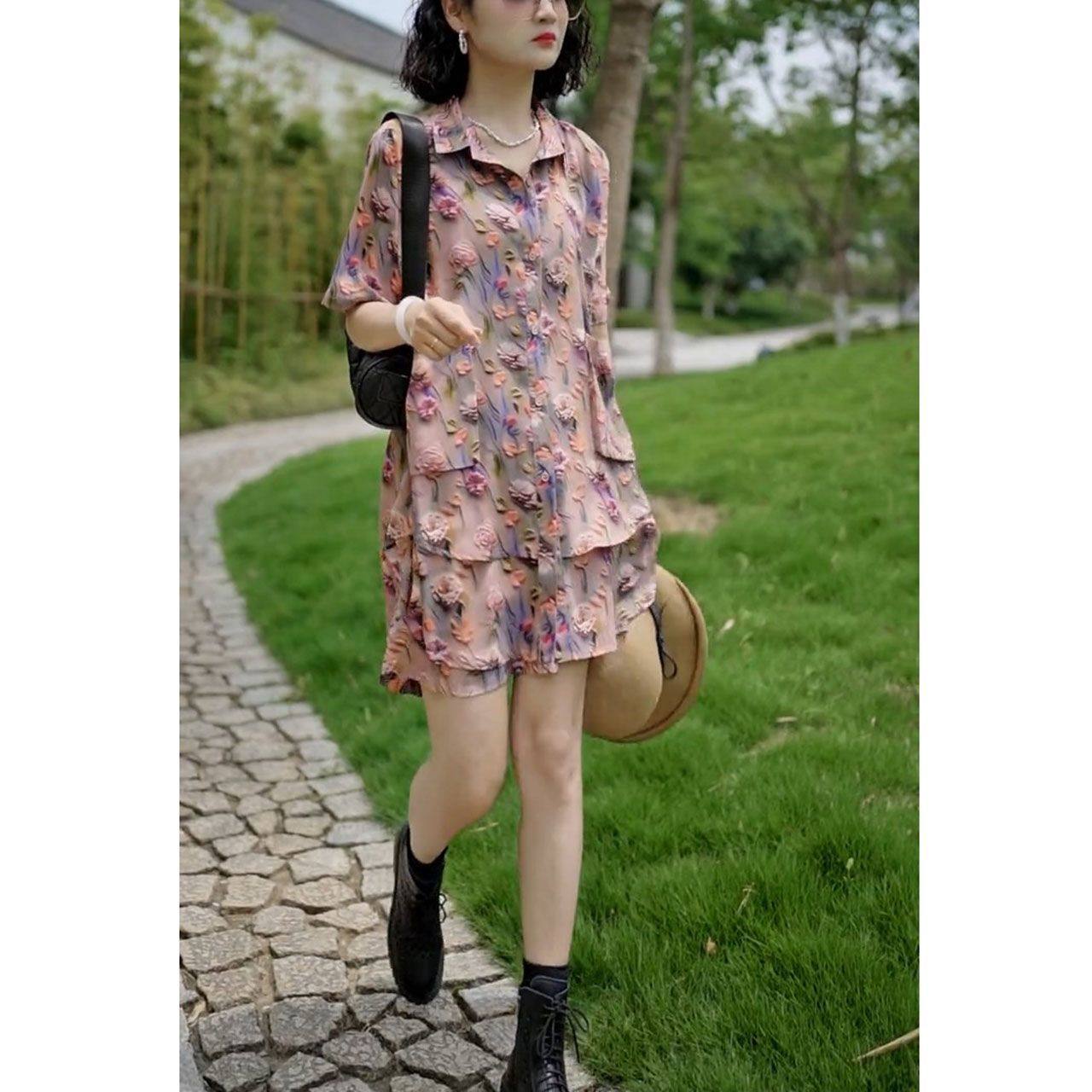 时尚大码碎花POLO领短袖上衣短裤两件套女2025夏新款休闲显瘦套装
