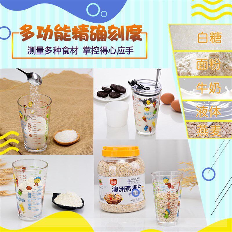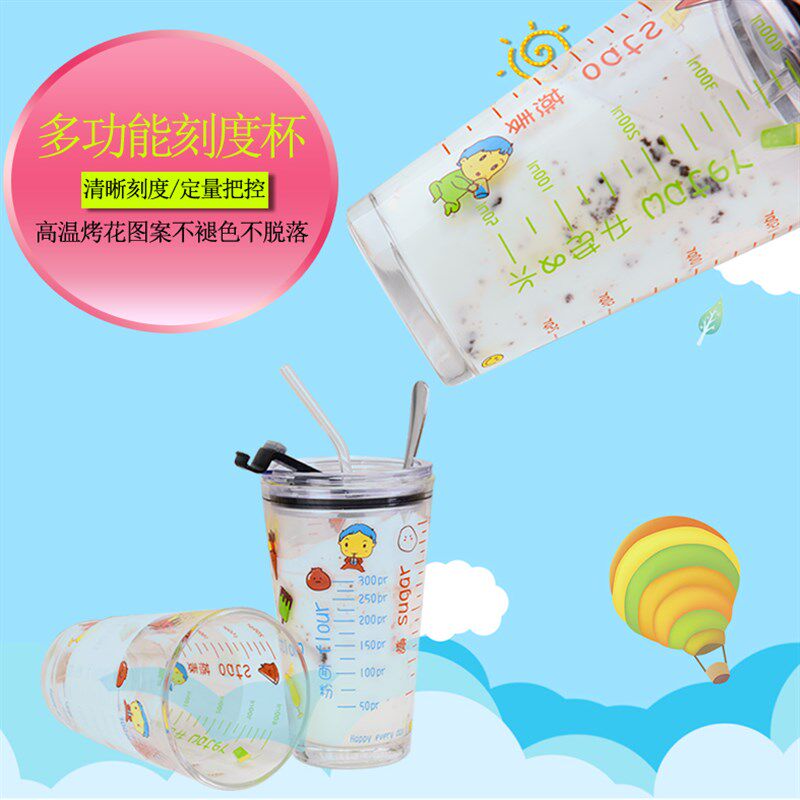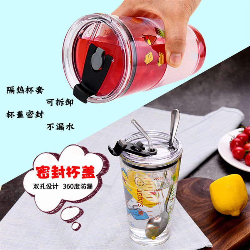 刻度杯牛奶杯带勺子吸管大玻璃杯耐热杯子带盖水杯女家用可爱大人