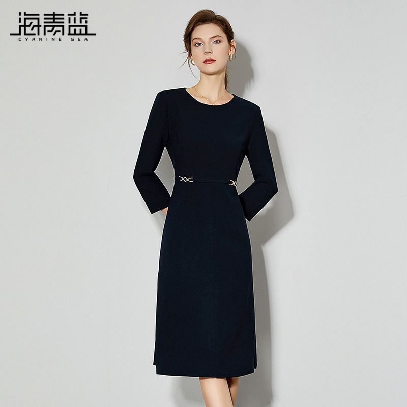 海青蓝气质洋气蓝色连衣裙2025春装新款职业正装七分袖中长款裙子