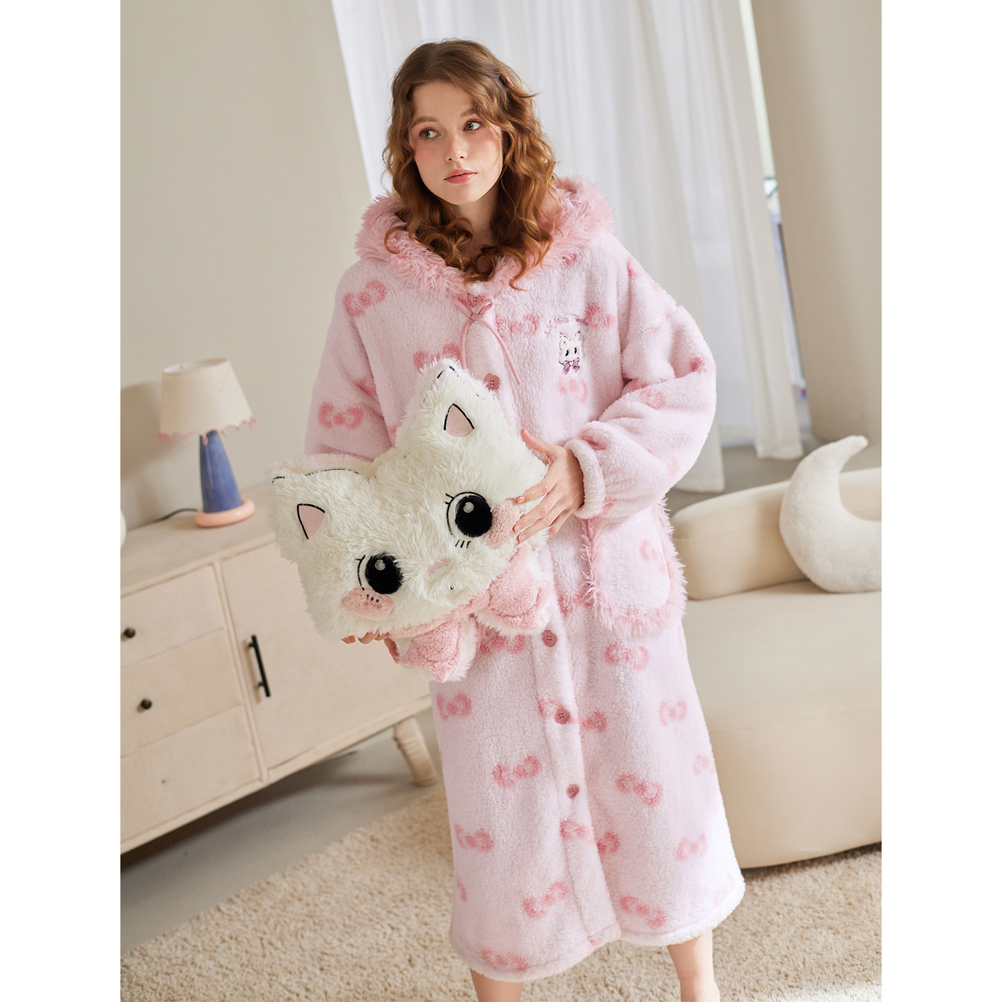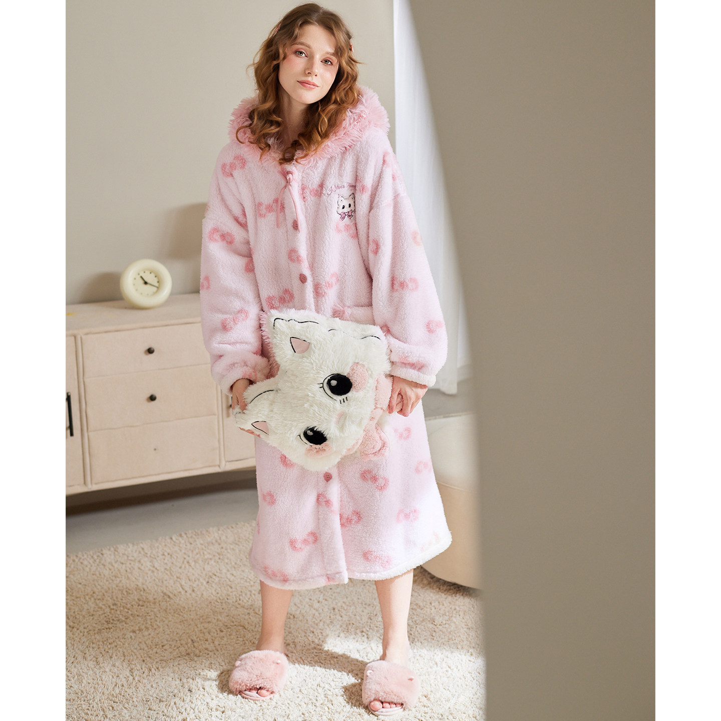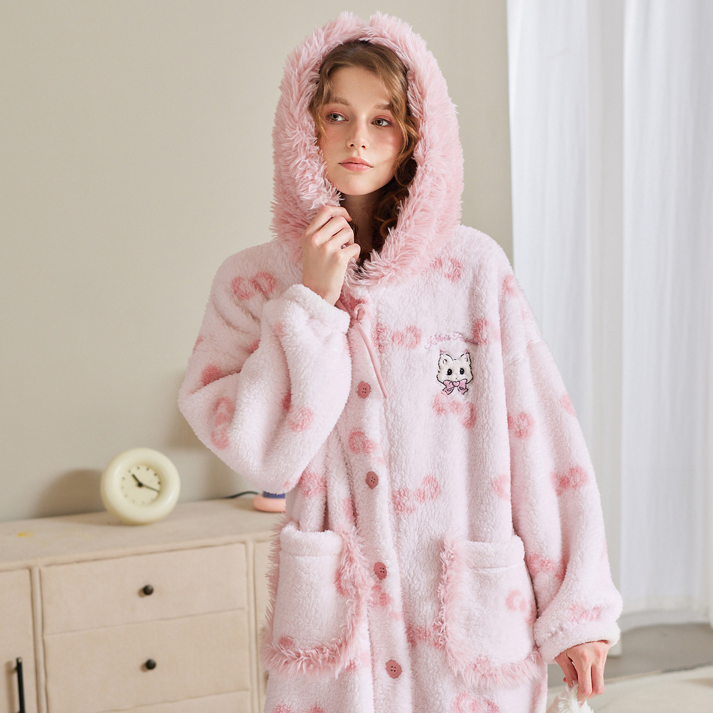 芬腾女士睡袍秋冬季珊瑚绒长袖连帽睡衣甜美休闲加大码家居服冬天