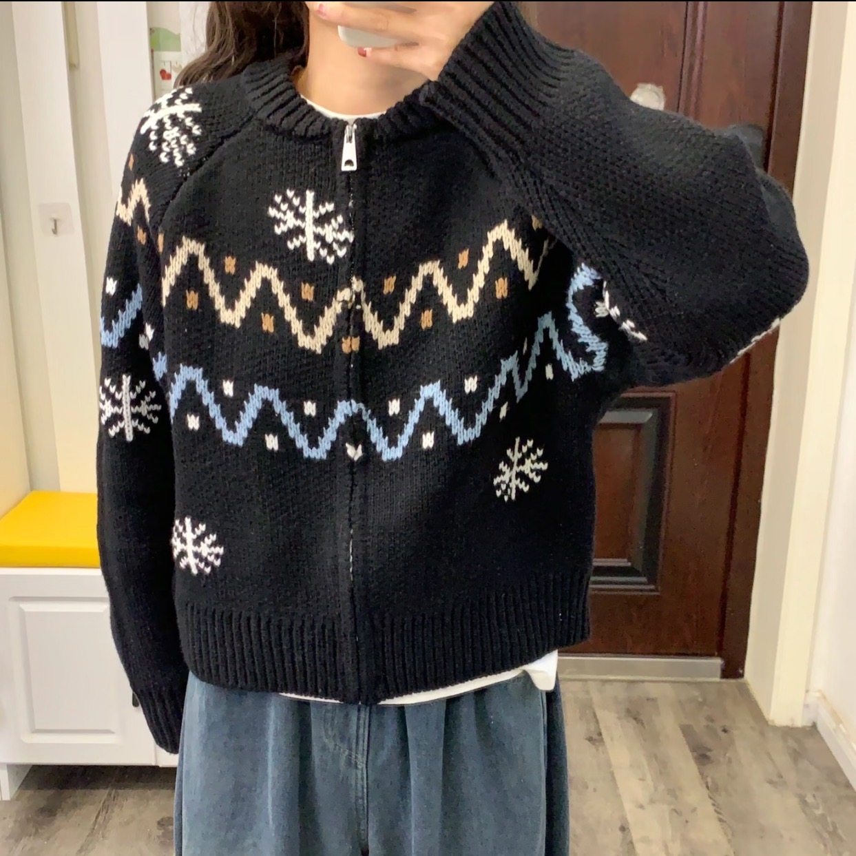 氛围感!黑色复古费尔岛雪花拉链毛衣开衫女春季新款宽松针织上衣