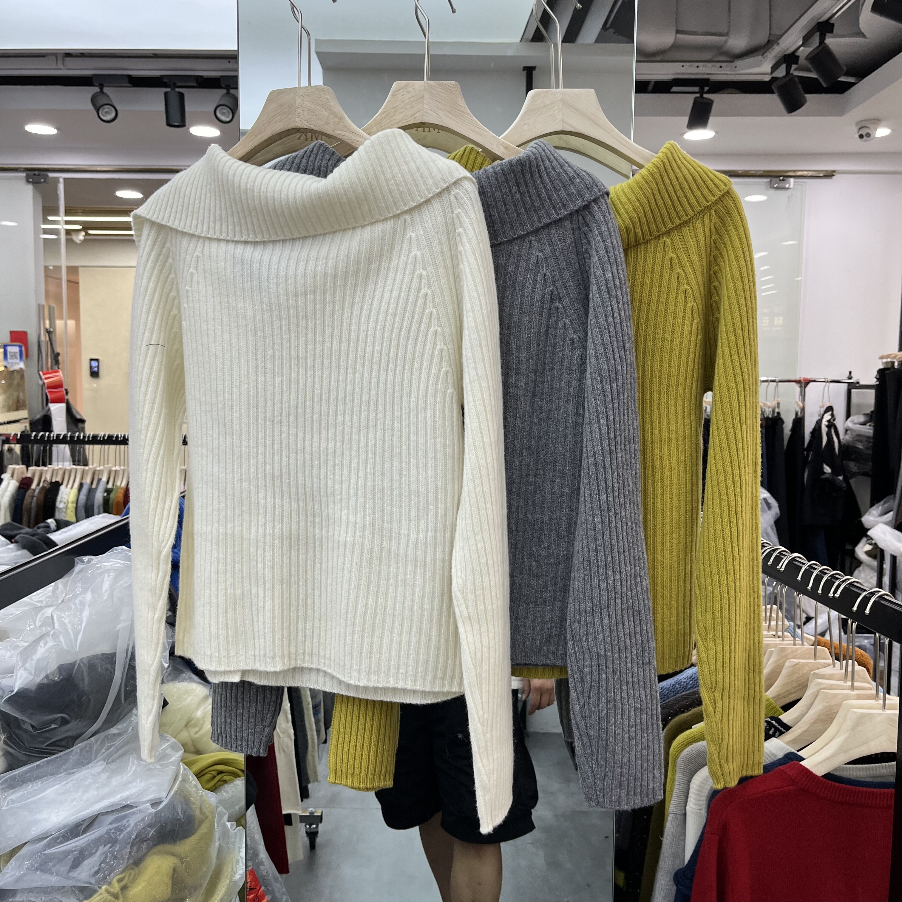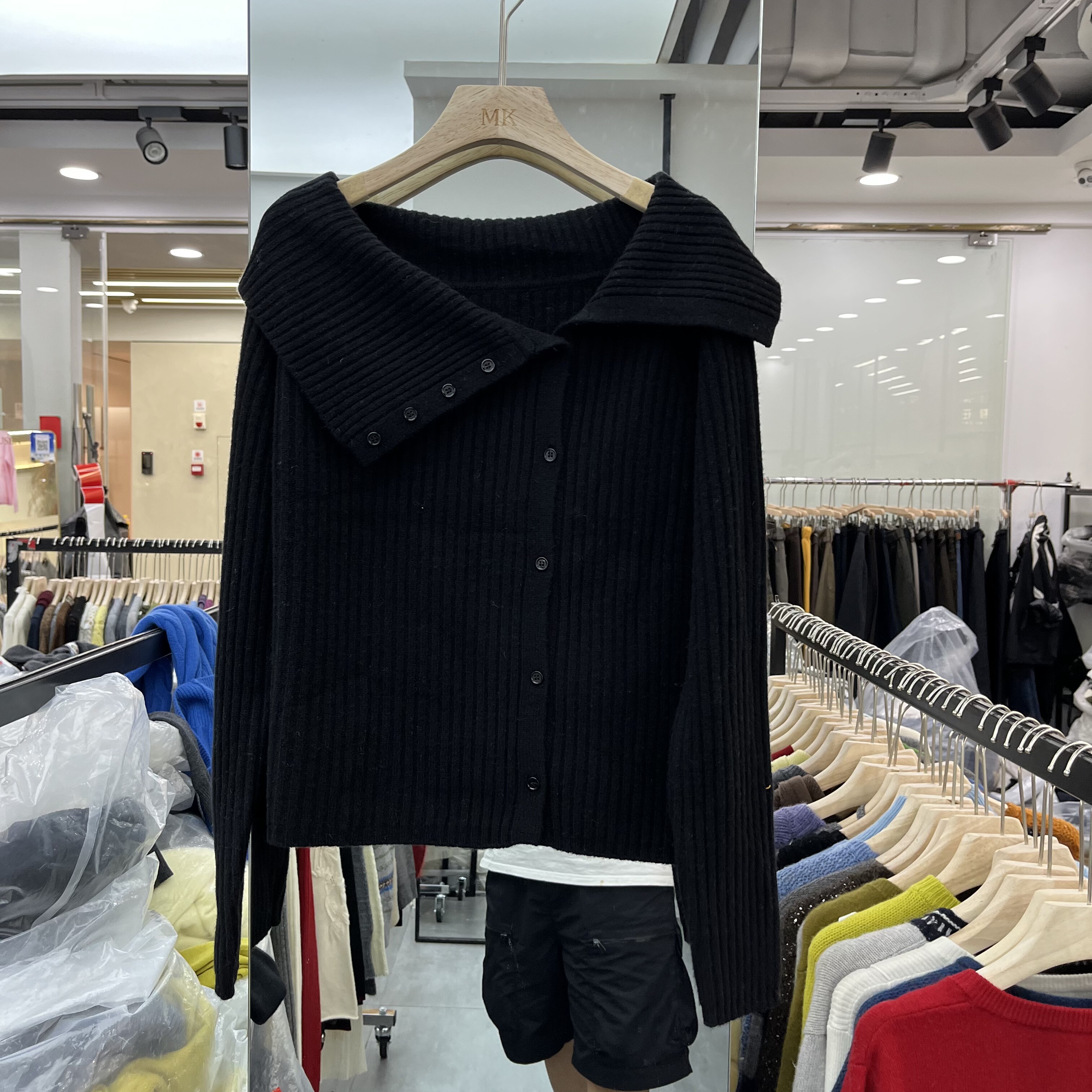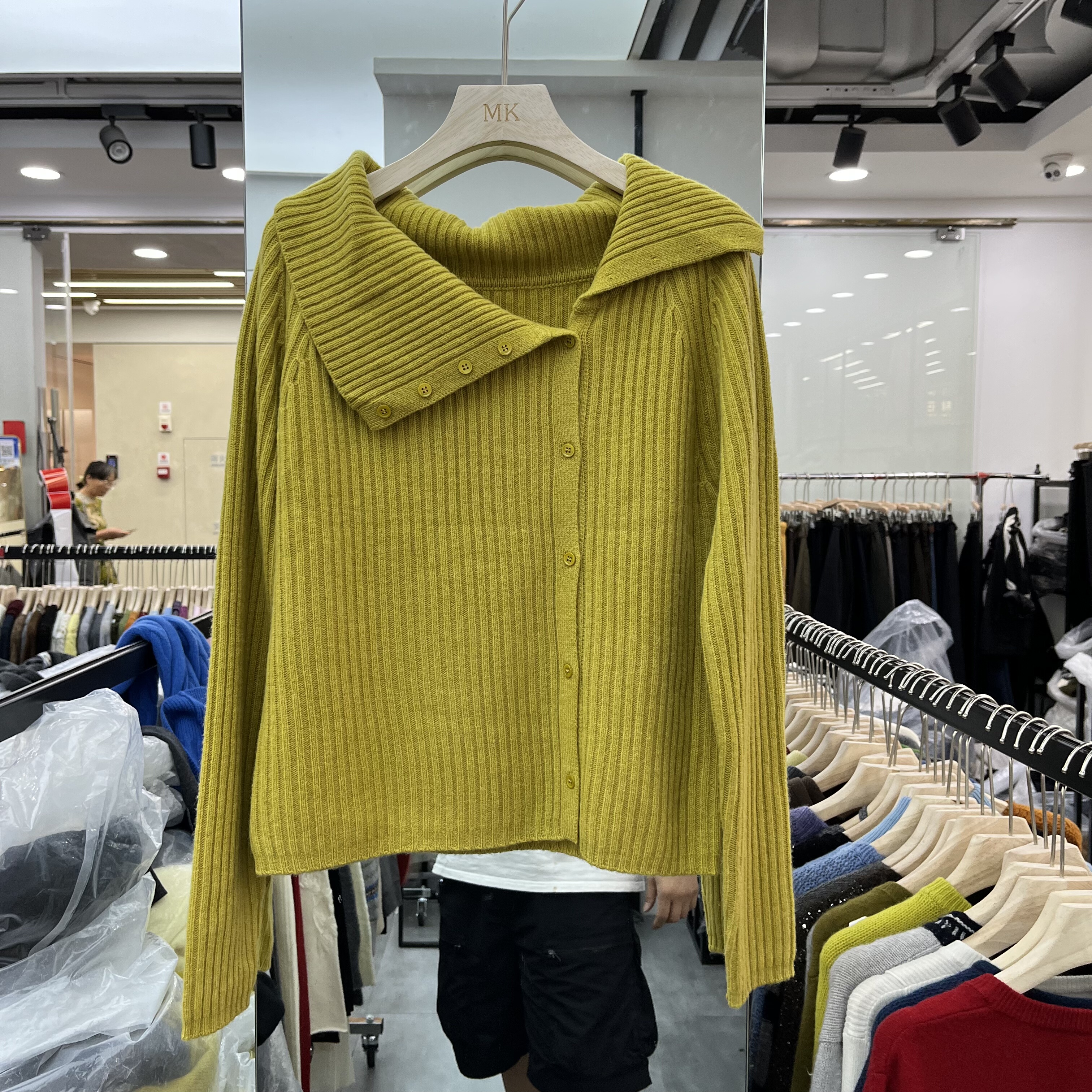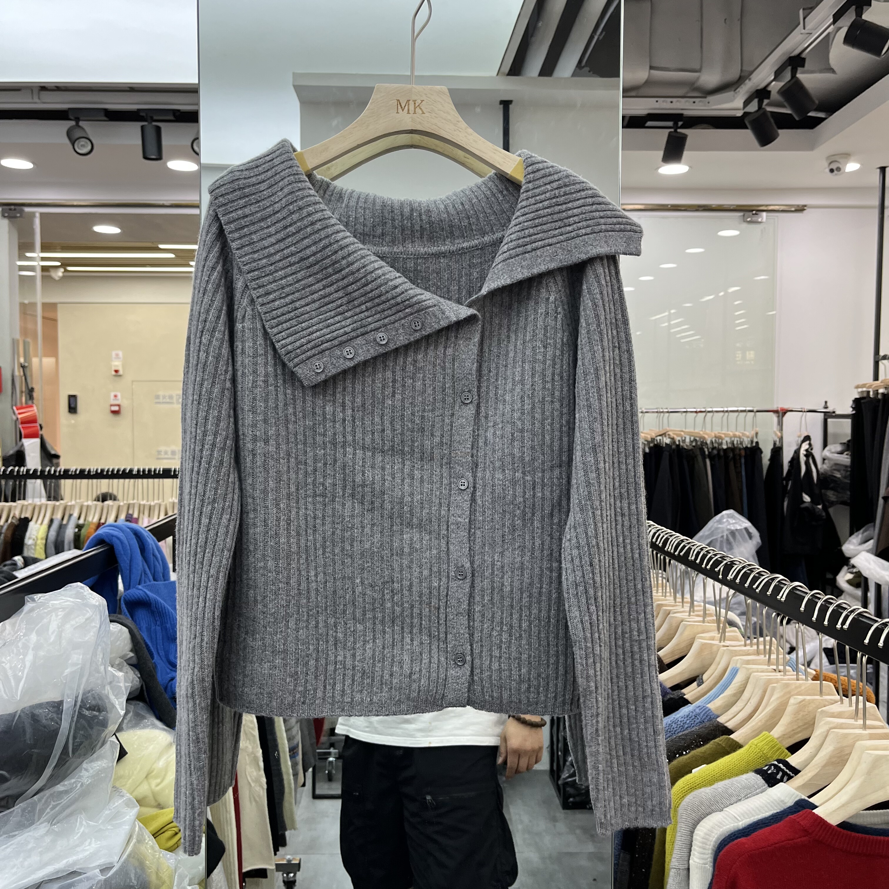 欧洲站2025秋季新款女士翻领侧边扣纯色全羊毛长袖开衫欧货针织衫