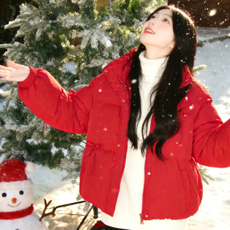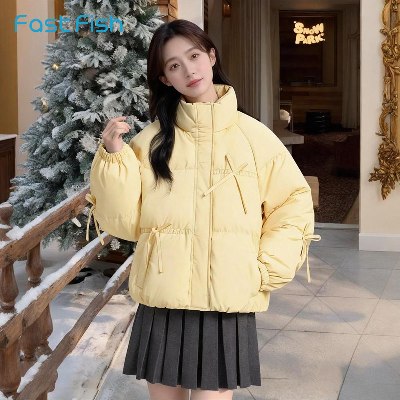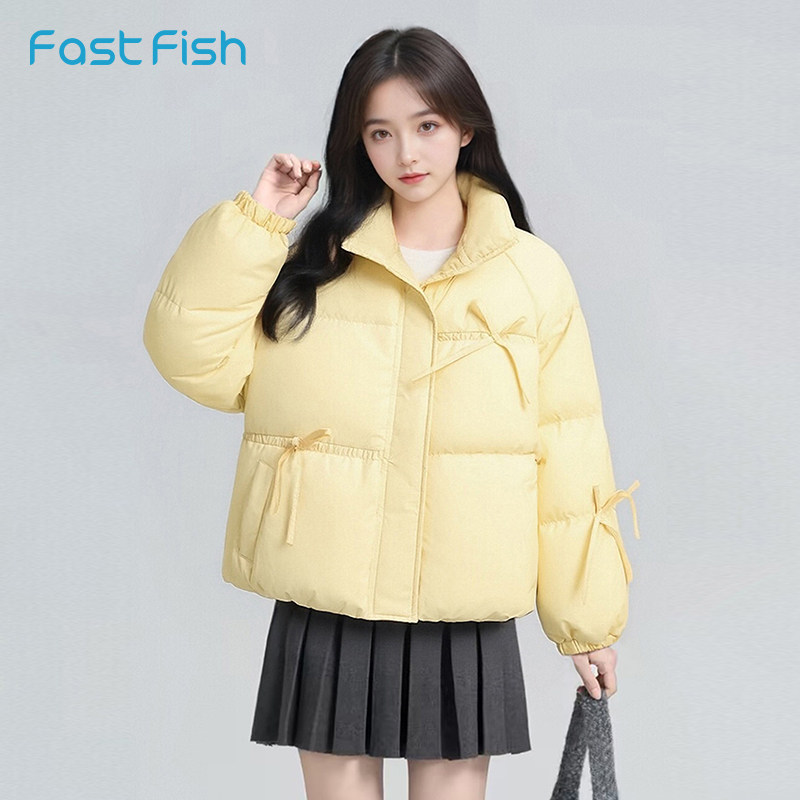 快鱼蝴蝶结蓝色立领羽绒服女款2025年冬季新款短款外套保暖面包服