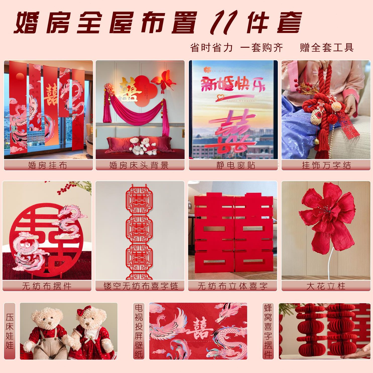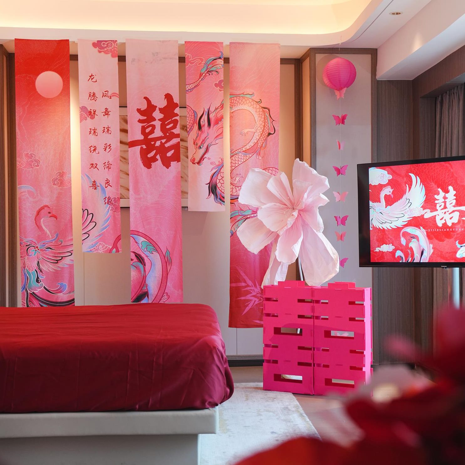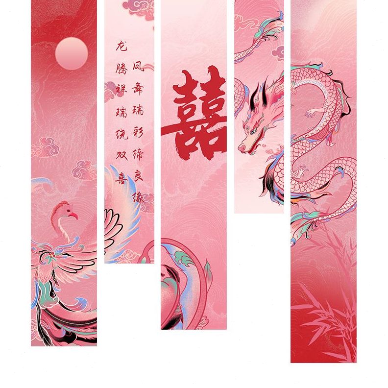 床头背景墙男凤布卧室结婚装饰拉花方龙女婚房布置新中式幔方新房