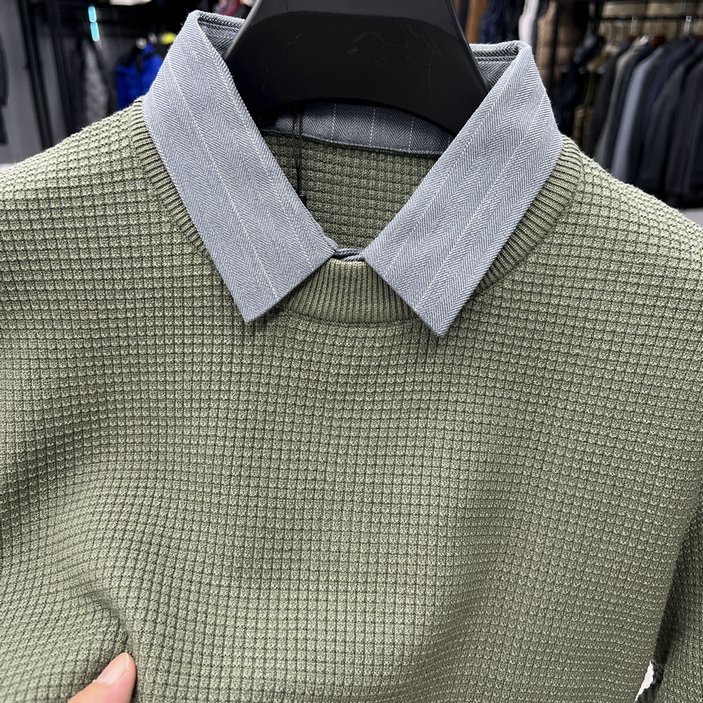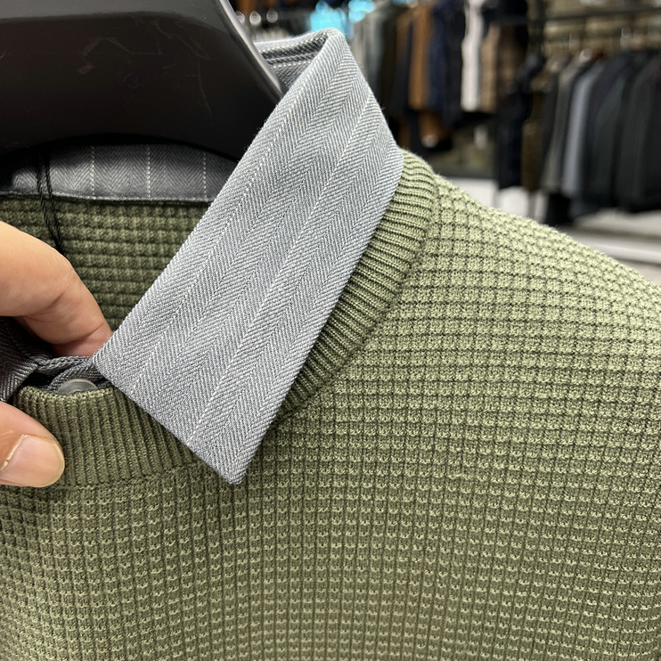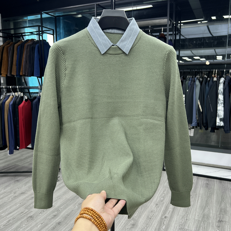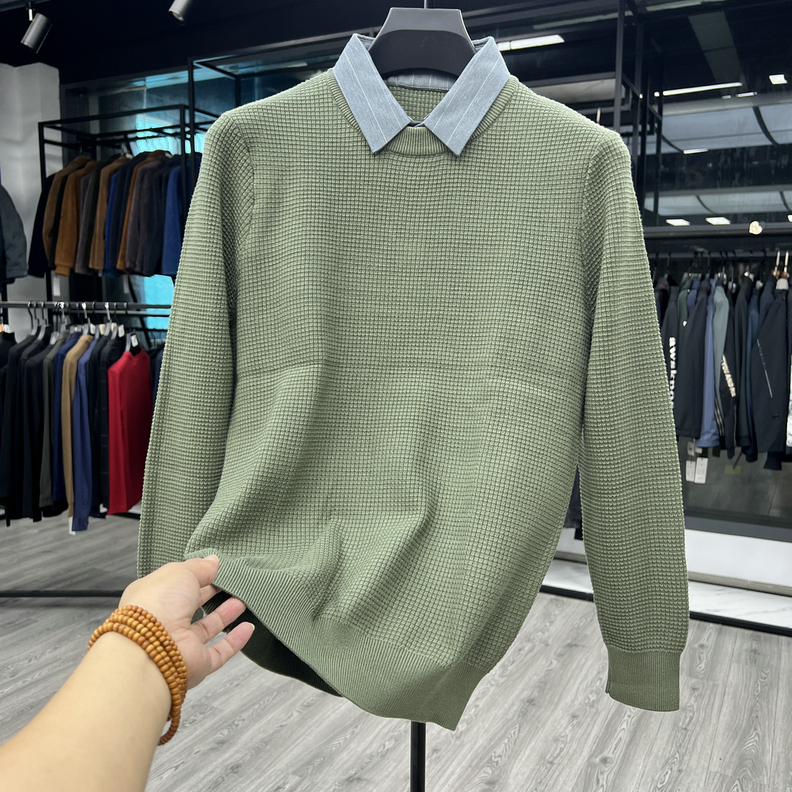 国内尾货衬衫领时尚休闲华夫格针织肌理秋季厚毛衣针织衫青年上衣