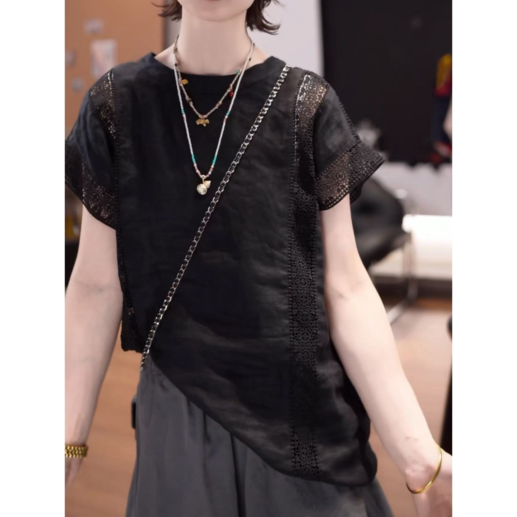 设计感蕾丝镂空纯色亚麻圆领短袖T恤女夏季新款百搭休闲上衣