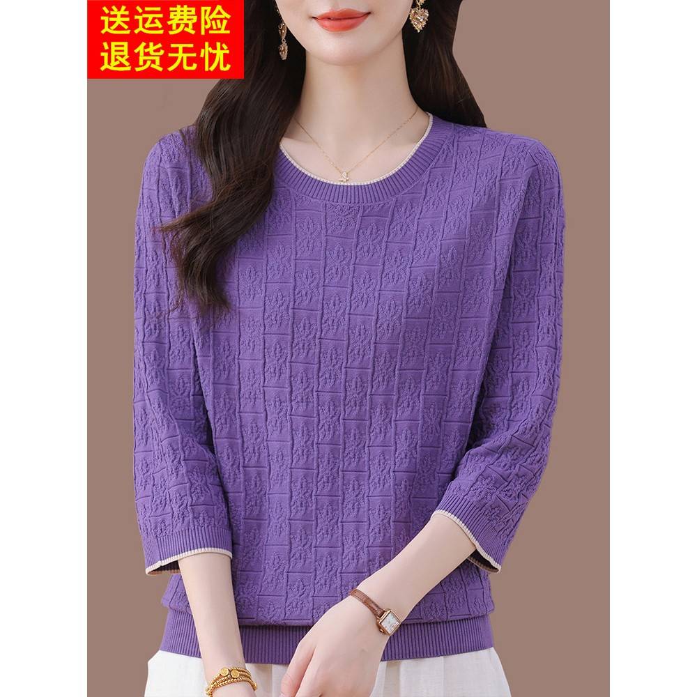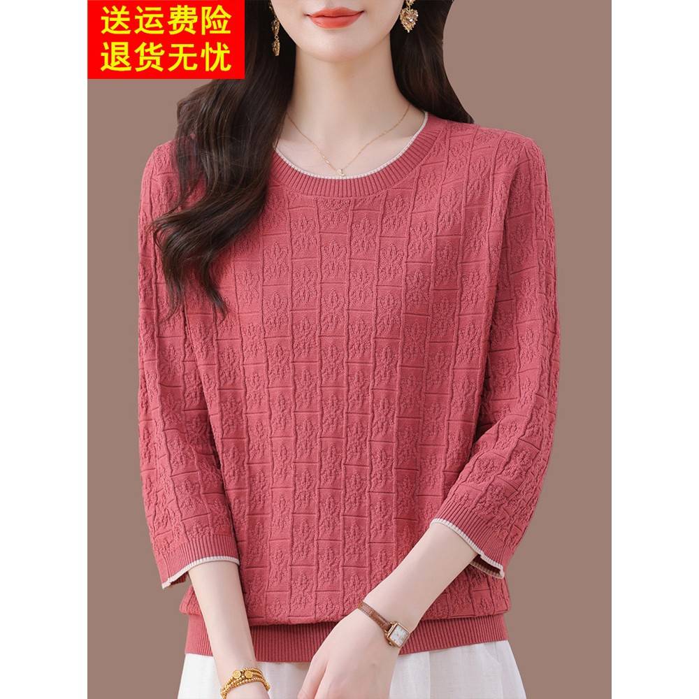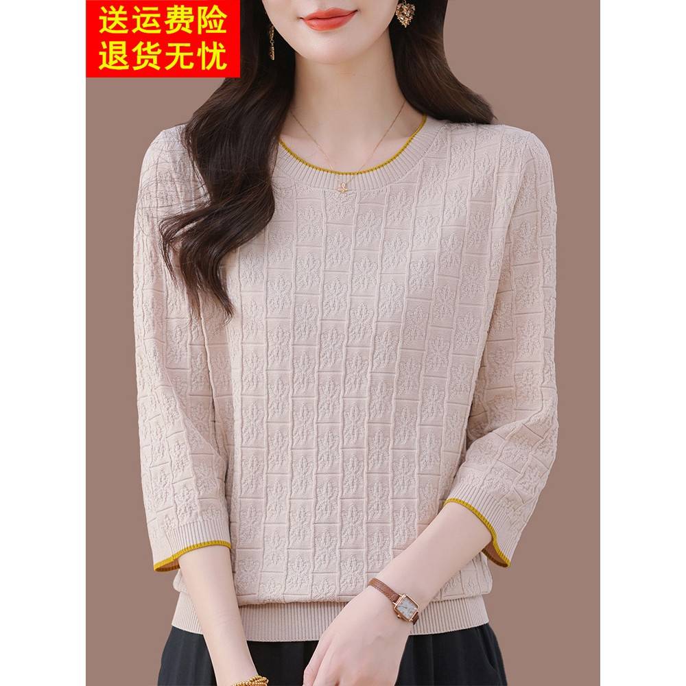 早秋新款桑蚕丝七分袖t恤女秋季妈妈装洋气宽松遮肚中袖针织小衫