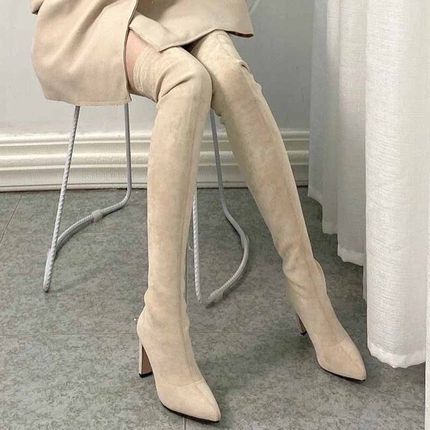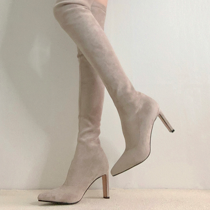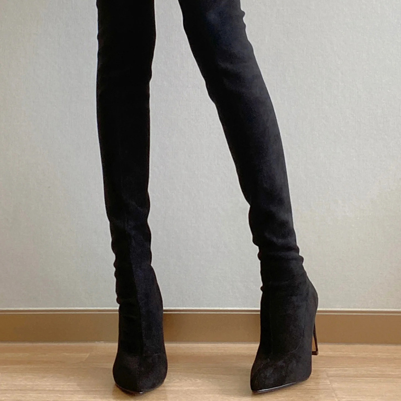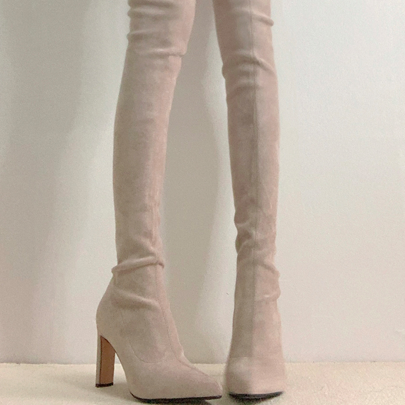 敲显腿长!显腿瘦过膝高筒弹力瘦瘦靴绒面粗跟长筒靴高跟尖头长靴